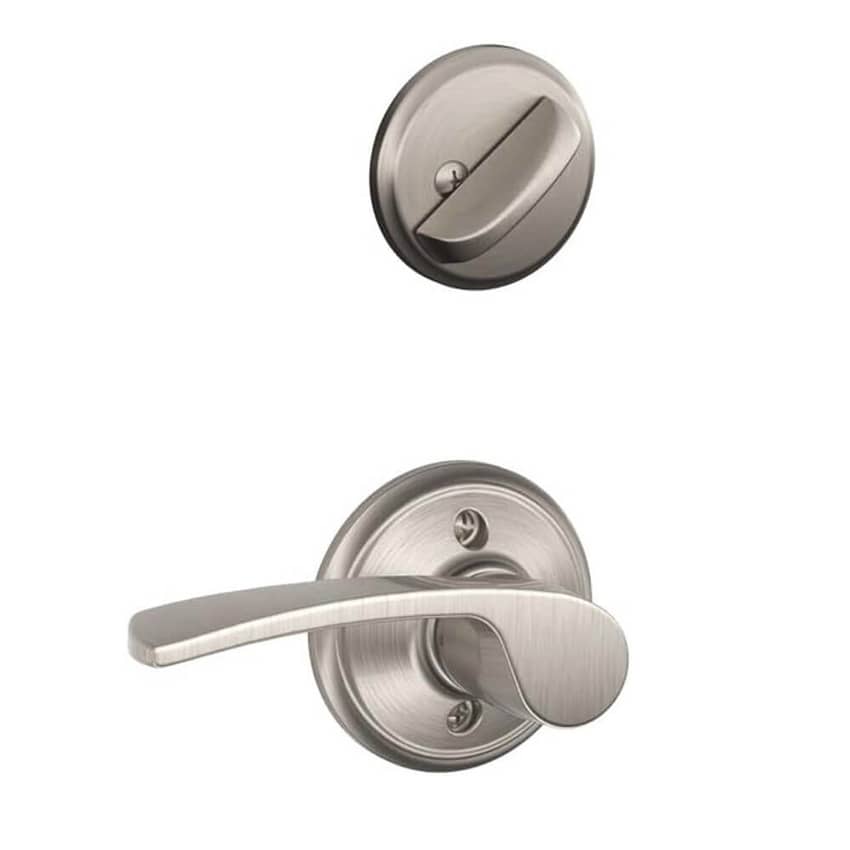 Upgrade your interior doors with the Schlage Merano Interior Right-Handed Door Lever with Deadbolt in Satin Nickel. This single unit provides the lever handle for the inside of your right-handed door. It features a sleek and stylish design with a beautiful satin nickel finish that complements a variety, however, please note that this is only the interior lever and requires the F58 handle set to complete the installation for a fully functional door handle. For a clean and secure fit, a minimum center-to-center door prep of four inches is required.