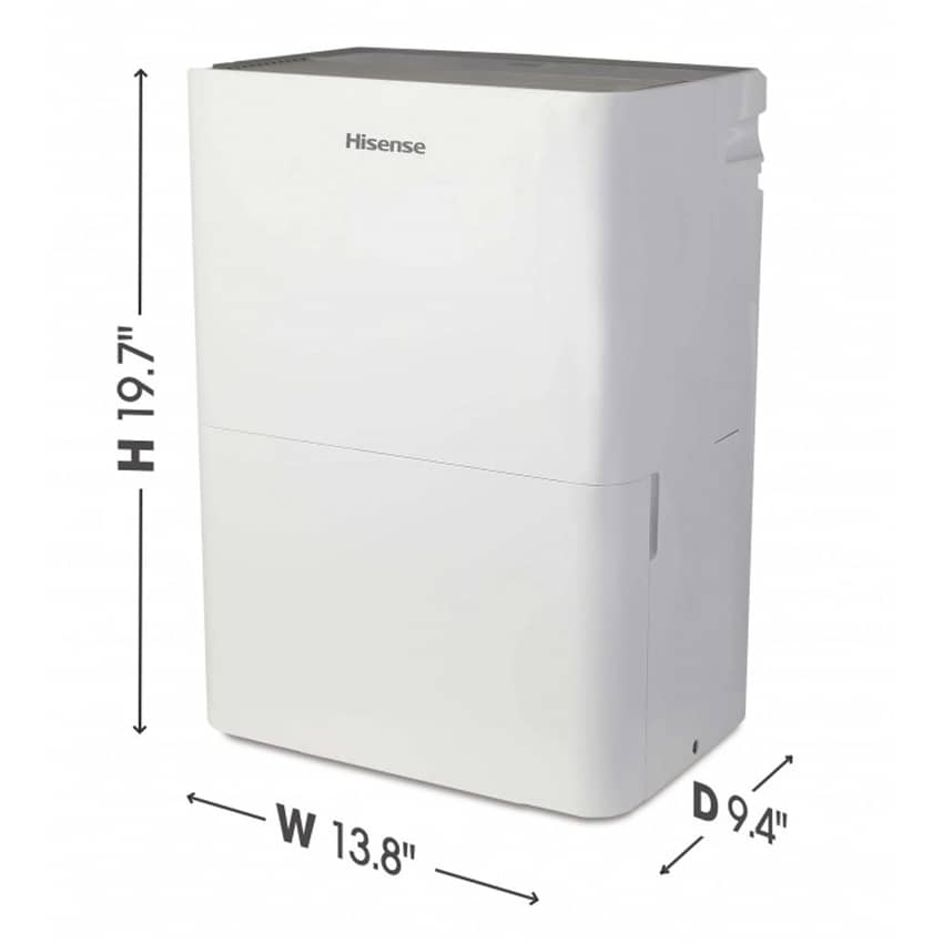 This Factory Refurbished Hisense 35 Pint 3-Speed Compact Dehumidifier, in a clean white finish, is a powerful solution for tackling excess moisture in your home. Despite its compact size, it efficiently removes up to 35 pints of water daily, covering areas up to 3000 square feet. Its ability to operate in temperatures as low as 38 degrees Fahrenheit makes it ideal for basements and garages. The easy-carry handle and automatic shut-off feature provide convenience and safety, while its ENERGY STAR certification ensures efficient and quiet operation. Weighing 32.6 pounds, this dehumidifier is designed to fit seamlessly into various spaces, offering reliable moisture control. This dehumidifier weighs 32.6 pounds, and measures 13.8 inches long, 9.4 inches wide, and 19.7 inches high.