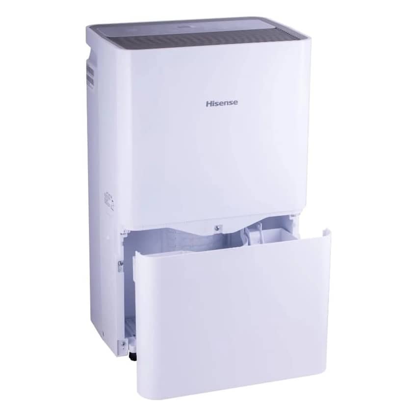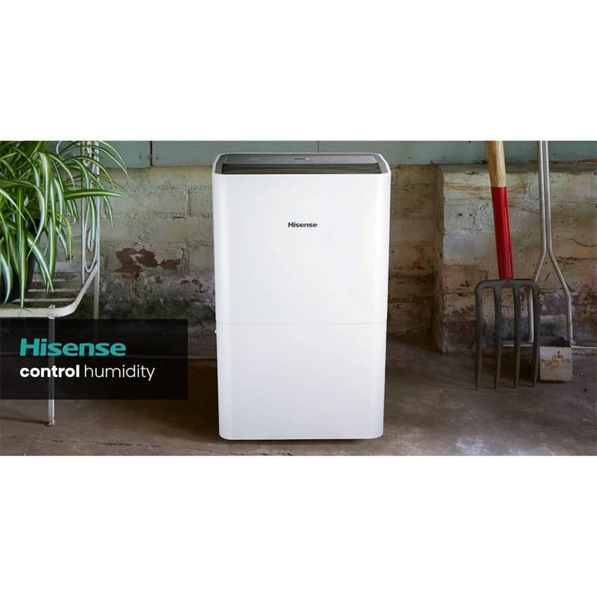 - The Hisense Energy Star 50 Pint 3-Speeds Dehumidifier quietly collects water into the slide out internal bucket or can discharge the water via connecting a garden hose (not included) through the side of the cabinet