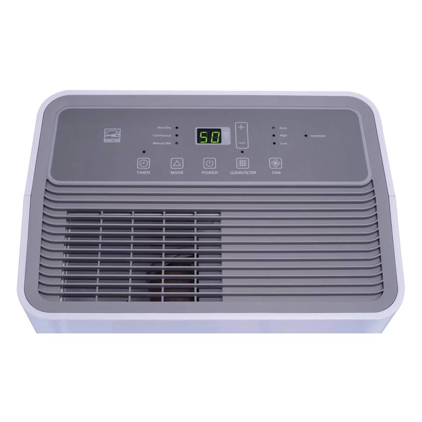 Optimize the humidity levels in your home with the Hisense Energy Star 50-Pint Capacity 3-Speed Dehumidifier, a reliable and eco-friendly unit in crisp white, perfect for spaces up to 4,500 square feet. This versatile dehumidifier quietly collects moisture into its slide-out internal bucket or offers continuous drainage via a garden hose (not included). Capable of operating in temperatures as low as 38 degrees Fahrenheit, it provides flexible control with three operating modes (manual, continuous, and auto dry), all while maintaining a remarkably low sound level for minimal disturbance. Enjoy enhanced comfort and protection at home with simple controls, a programmable 24-hour on/off timer, an adjustable humidistat, and a convenient full-tank alert/shut-off feature to prevent overflows. This dehumidifier weighs 38 pounds and measures 15.1 inches long, 10.7 inches wide, and 24.8 inches high.