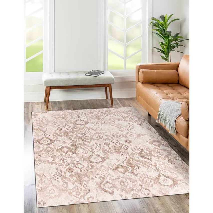 The Hazel Collection Ikat Area Rug in Beige, and Ivory is a luxurious and durable addition to any home. Its super soft 100% polyester pile provides a plush and comfortable underfoot experience, while the cotton backing adds durability and stability. This rug is non-flammable, fade-resistant, and stain-resistant, ensuring long-lasting beauty. The anti-static properties help to prevent dust and pet hair from accumulating, making it easy to keep clean. Made in Turkey with a pile height of 10 millimeters, the Hazel Collection rug is a stylish and practical choice for any room in your home. This rug measures 9 feet wide, and 12 feet long.