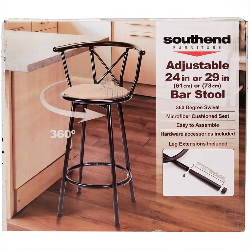 The adjustable bar stool by Southend Furniture is an attractive addition to your breakfast counter or bar area. A cushioned microfiber seat and curved back provide support while you enjoy a meal or catch up with friends. Seats swivel 360 degrees for easy movement. This chair is easy to assemble, and all hardware accessories are included. It even comes with 7-inch leg extensions so you can adjust the stool height from 24- to 29-inches.