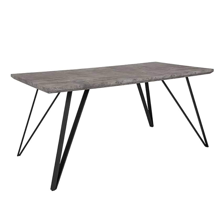 Create a beautifully modern dining experience with the Rectangular Faux Concrete Dining Table. This generously sized table combines a tasteful balance of materials, featuring a sleek black powder-coated metal frame and striking triangular-shaped legs. The 1-inch thick tabletop is finished in a beautiful faux concrete, providing a simple yet compelling focal point for your dining room. Its laminate distressed wood finish adds a touch of rustic charm to its otherwise modern design. Gather friends and family around this table to share delicious food and great conversation. With adjustable floor glides, this table is both functional and stylish.