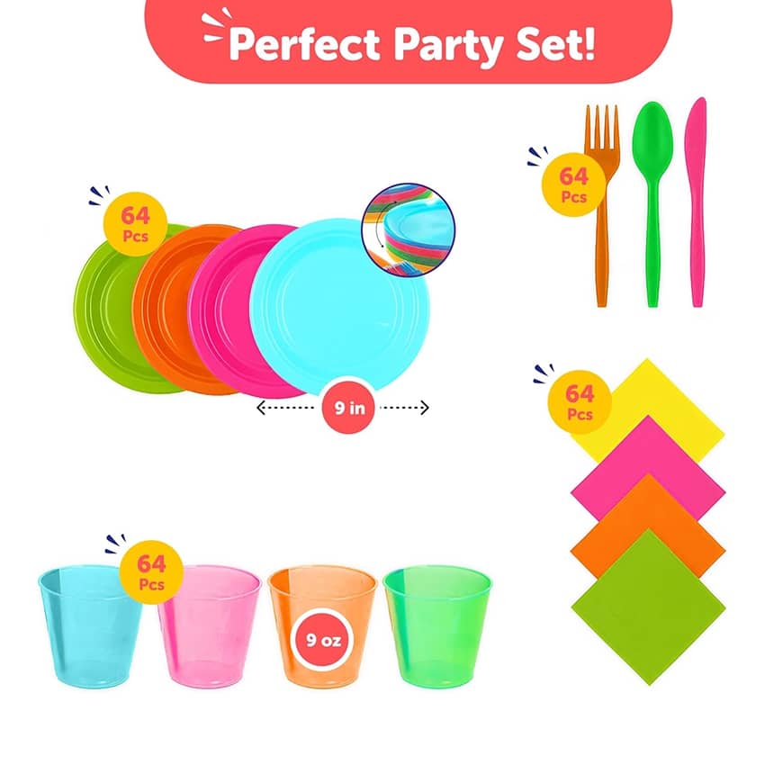 - 256-Piece Set: Includes 64 neon plates (9"), 64 neon cups (9 oz), 64 napkins & 64 sets of neon utensils—perfect for glow-in-the-dark parties, fiestas & birthdays