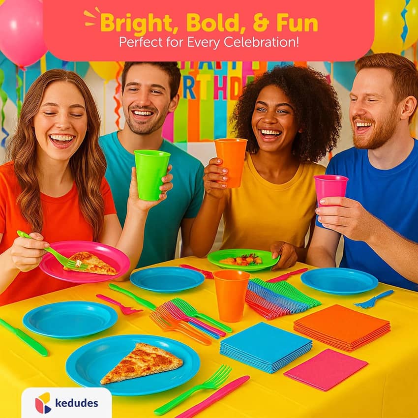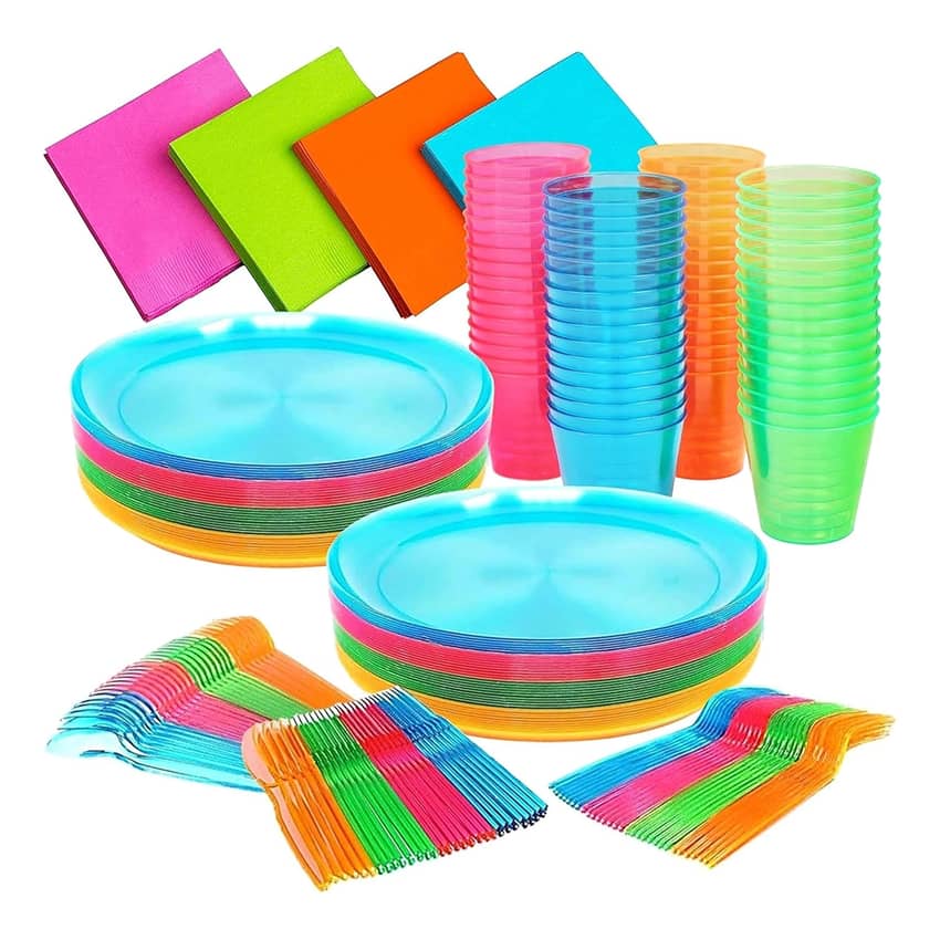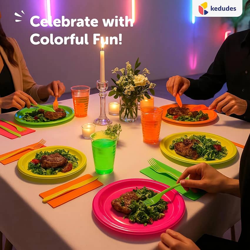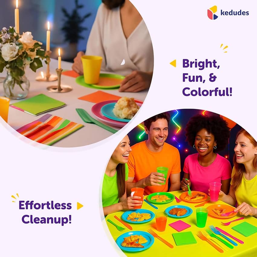 - Enjoy the party without worrying about the mess—these disposable neon party supplies make post-party cleanup quick and effortless