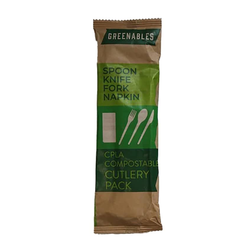 Make your next event eco-friendly with the Greenables Compostable Pre-Packaged Cutlery Set. This convenient 100-pack provides everything your guests need, including a spoon, knife, fork, and napkin, all neatly pre-packaged for hygiene and ease of distribution. Crafted from CPLA (Crystallized Polylactic Acid), this durable black cutlery offers a sturdy alternative to traditional plastics while being 100% compostable, allowing you to reduce your environmental footprint without compromising on quality or convenience.