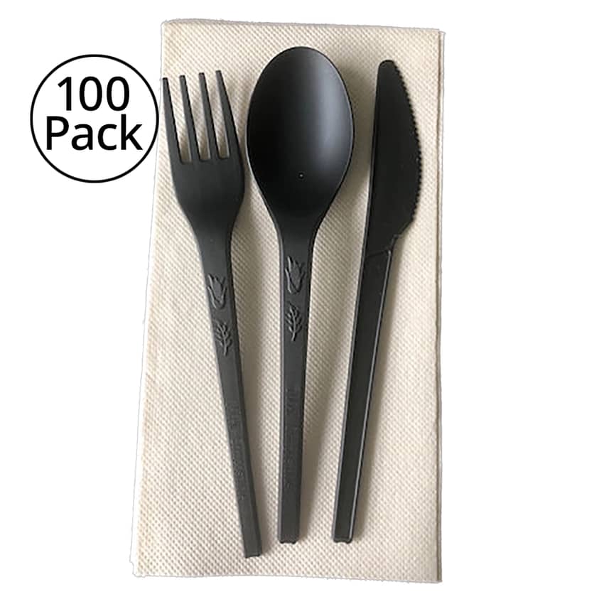 Greenables Compostable Pre-Packaged Cutlery Set, Black, 100 Pack