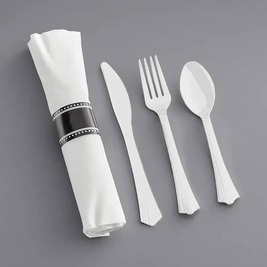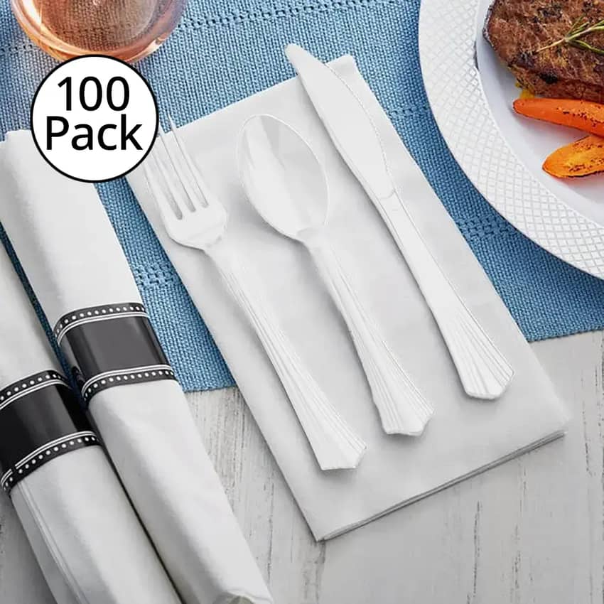 - Pre-rolled and ready-to-use, you'll save time and labor at catering events and wedding receptions with this pre-rolled linen-feel white napkin and silver heavy weight plastic cutlery set