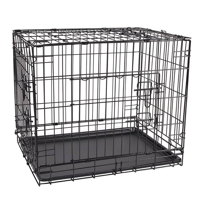 Our private-label Huntington Pet Products three-door small pet crate is perfect for our furry friends weighing 10-40 pounds! Measuring 18 inches wide by 24 inches long by 21 inches high, the small Huntington pet crate is great for Beagles, Cocker Spaniels, Irish Setters, Bull Terriers, Basenjis, and more! Front, side, and top doors give you easy access, and the crate divider lets you customize the size of the crate as your puppy grows. Our crate folds flat for easy storage or travel. Corner protectors prevent unnecessary scuffs and scratches on your floors, and the easy-clean plastic tray lets you clean up messes without hassle.