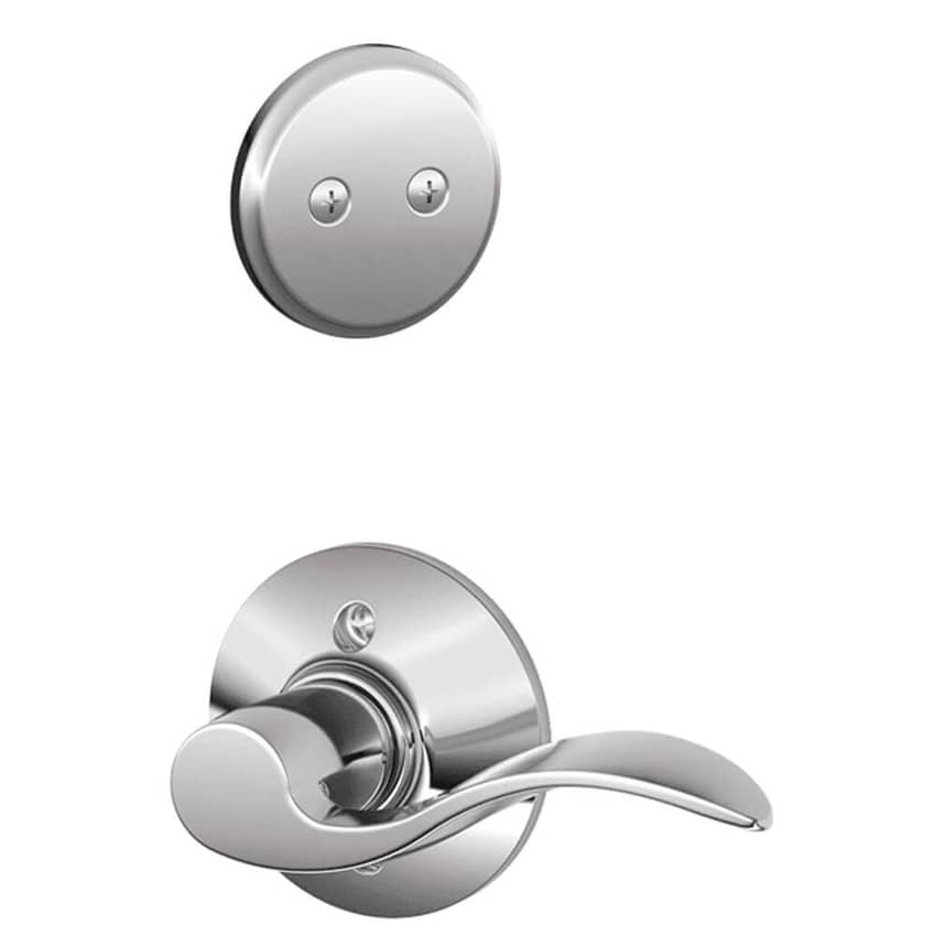 Spruce up your interior doors with the Schlage Accent Left-Handed Dummy Interior Pack in Bright Chrome. Designed for left-handed doors, or doors where the hinges are on the left when facing the room, it includes the inside lever trim, deadbolt cover plate, and all necessary screws. Simply pair it with a Schlage F93 product to create a complete and stylish entry set. Easy installation with just a screwdriver lets you update your doors in minutes. Built with high-quality materials and boasting a bright chrome finish, this Grade 2 certified Schlage lever adds a touch of elegance and functionality to your home.