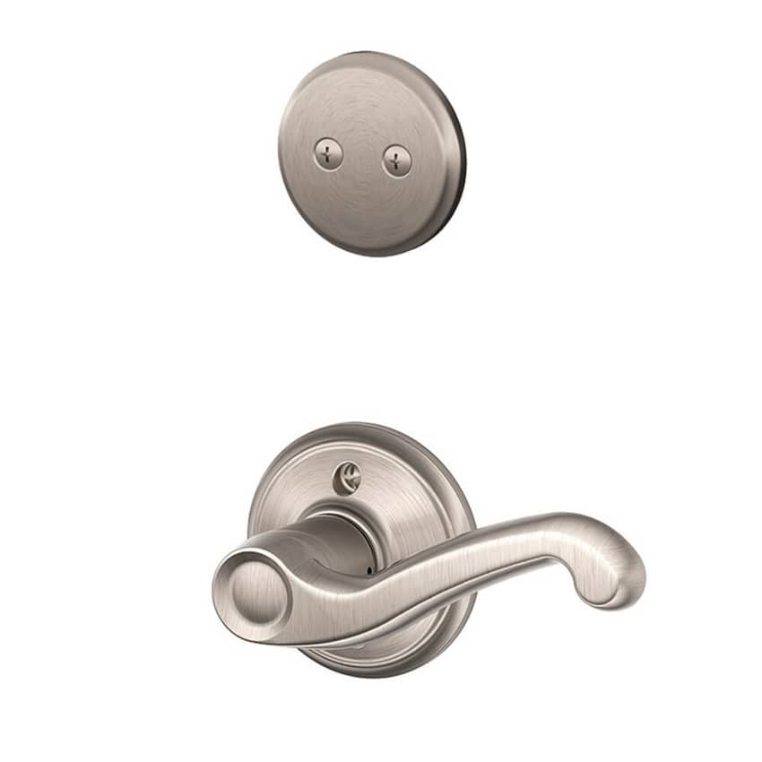 The Schlage Flair left-handed dummy interior pack in satin nickel is a high-quality, durable addition to any home. The dummy function is perfect for interior doors that do not require a latch or lock, such as closets or pantries. This interior pack is designed to be paired with a Schlage F93 product to configure a complete entry set. It consists of the inside lever trim, deadbolt cover plate, and screws. This handle is perfect for doors with hinges on the left side when viewed from the outside of the room. Installation is easy and requires only a screwdriver and a little time. This dummy lever is designed for doors at least 1.5 inches thick.