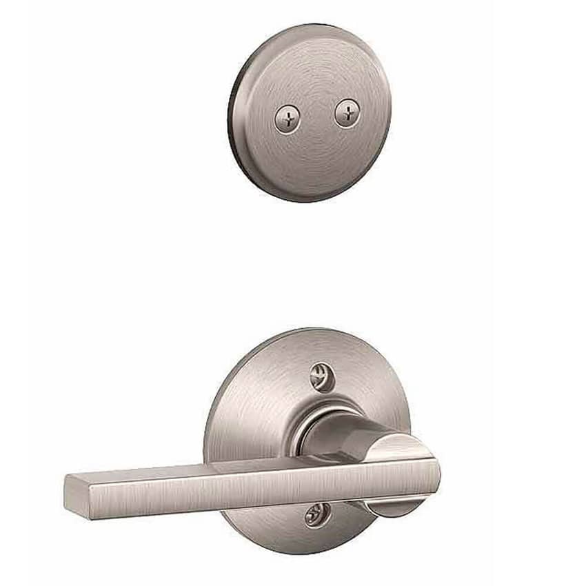 The Schlage Latitude dummy interior pack in satin nickel is designed to be used on interior doors where a latching mechanism is not needed. It is reversible, meaning that it can be installed on either left- or right-handed doors. The Latitude dummy interior pack contains everything you would see on the inside of the door, including the inside knob/lever, blank rose, and screws. It's designed to work with F-series handlesets with five-pin tumblers. The Latitude dummy interior pack is constructed from high-quality materials, including a durable metal construction and a satin nickel finish, to ensure that it will last for many years to come.