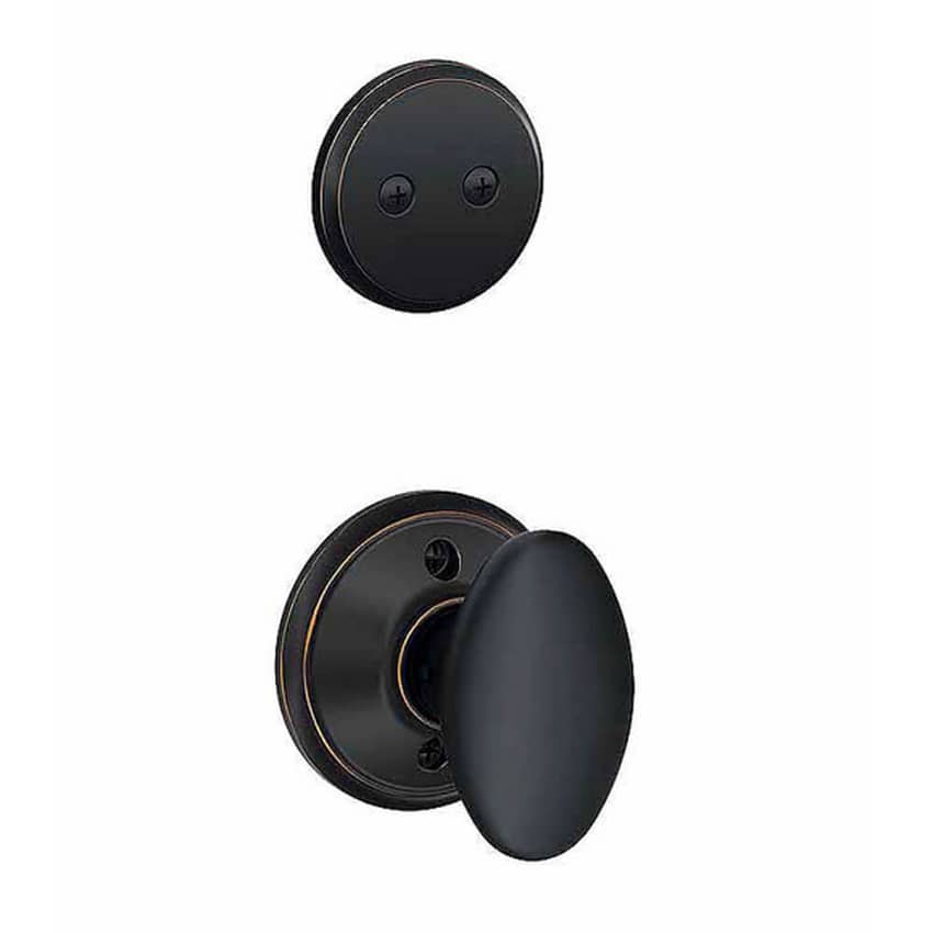 The Schlage Siena dummy interior pack in aged bronze works with Schlage F93 Series dummy cylinder handle sets to configure a complete dummy door set. This handle is non-functional and does not turn. The interior pack includes the inside knob and deadbolt cover plate only. It is easy to install and requires only a Phillips screwdriver. The set is designed to fit standard prep doors, and most installations should take just a matter of minutes. The Schlage Siena is made from high-quality materials and has an aged bronze finish. Aged bronze is a dark, warm brown that is classic and modern.