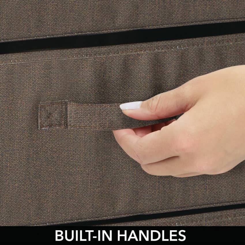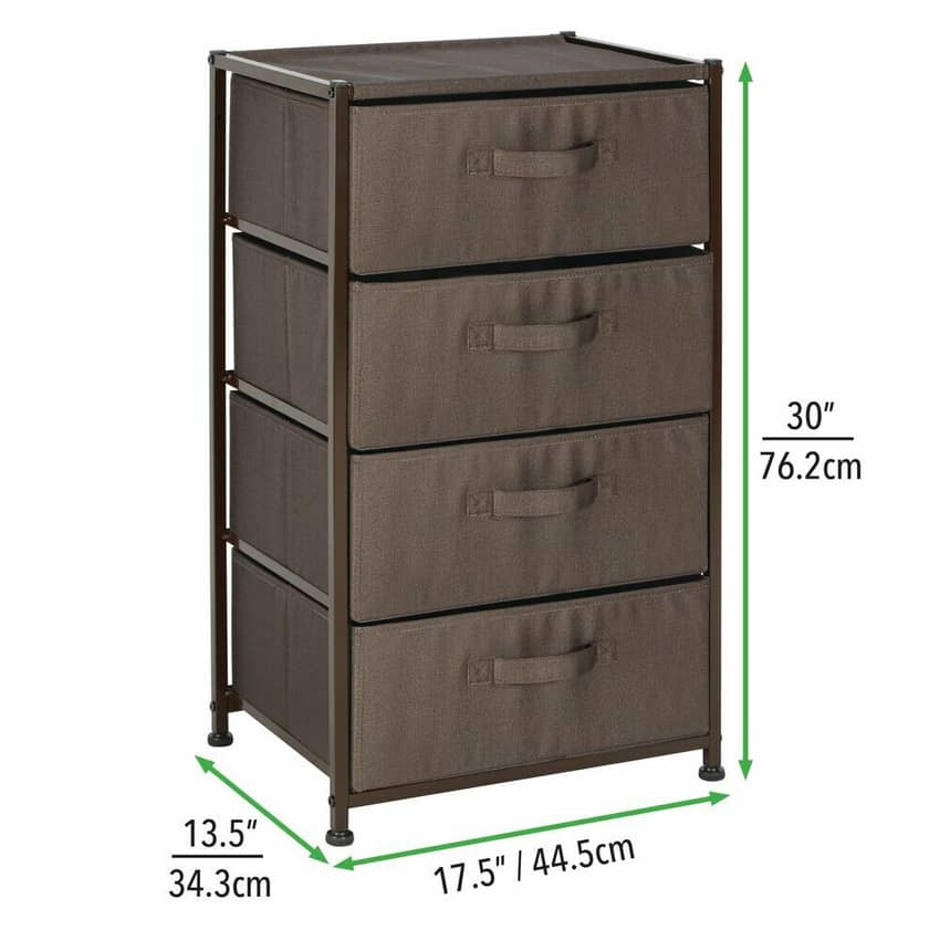 Need more storage? The mDesign four-drawer fabric storage dresser can keep all your hats, shoes, blankets, socks, baby items and more organized and out of sight! Measuring 13.5 inches deep by 17.5 inches wide by 30 inches high, this storage dresser is great for any home without a lot of storage, apartments, dorms, or condos. It can even fit in many closets. mDesign units are designed to mix and match to create the ultimate in attractive storage solutions. These drawers are fully removable and made of breathable non-woven synthetic fabric that cleans easily with a damp sponge and dry towel. Adjustable, non-scratch feet let you level your storage dresser on uneven surfaces. The dresser is easily assembled and comes with all hardware and detailed instructions.