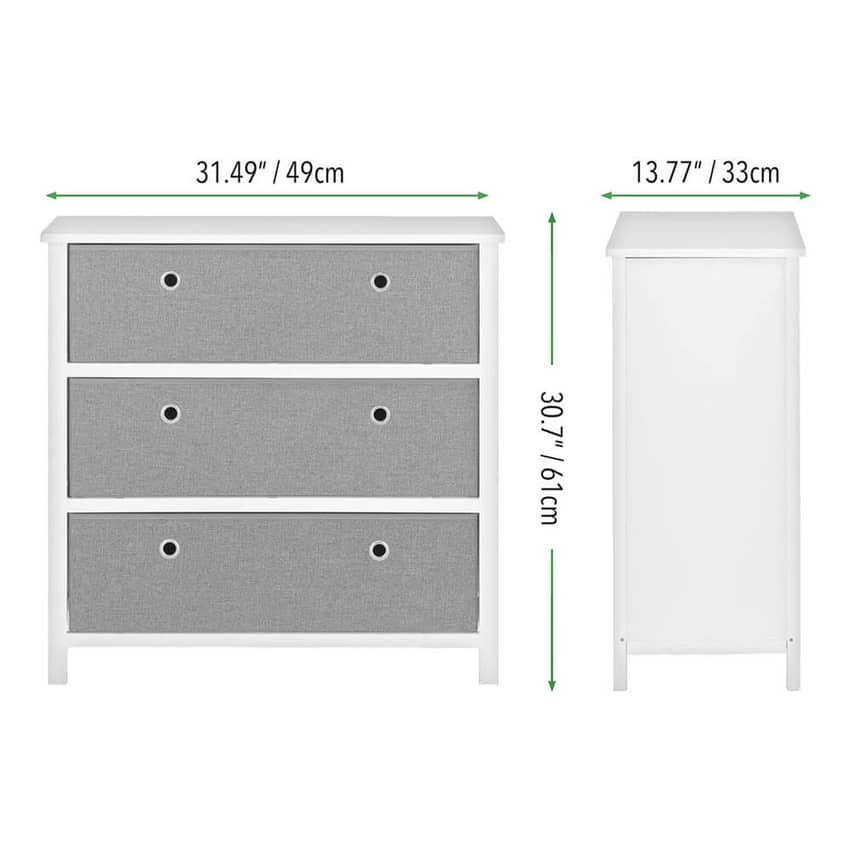 The mDesign wide dresser has three fabric storage drawers for a modern look perfect for any room in your home. It is compact enough to fit into small spaces while providing plenty of storage space for clothes, accessories, and other items. Each removable fabric drawer has easy-pull grommets, making it easy to access your belongings. The drawers are breathable, non-woven synthetic fabric, and the frame is made of strong and durable medium-density fiberboard wood. Instructions and hardware for assembly are included. The dresser weighs 24.51 pounds and measures 31.39 inches long, 13.77 inches deep, and 30.7 inches high.