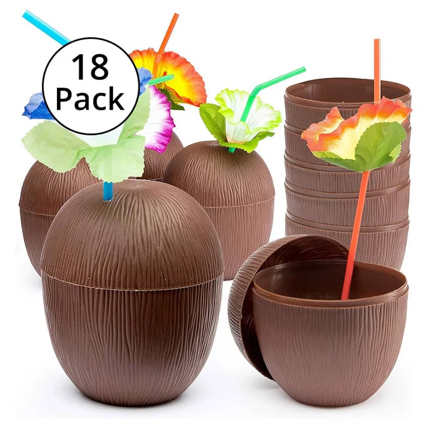 - 18 coconut-shaped cups with twist-off lids and assorted color bendable straws with a brightly-colored tropical hibiscus flower for the perfect Luau, Hawaiian, or Beach Inspired Party