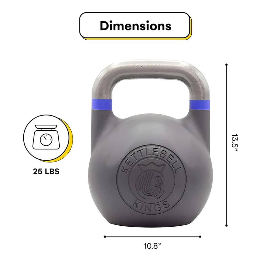 Unleash your full strength potential with the Kettlebell Kings 25-pound Competition Kettlebell, made for peak performance in intense training sessions. Crafted from durable cast steel, this kettlebell is built to withstand rigorous workouts, offering reliable performance every time. Its consistent dimensions across all weights and precise color-coding allow for seamless transitions between different kettlebell sizes, optimizing your training flow. The ergonomic design, featuring smooth 1.4-inch handles, ensures optimal comfort and a secure grip for both advanced users and beginners, helping to build grip strength. With its stable, flat-bottom construction, it's ideal for a variety of floor-based strength exercises, from squats to push-ups, making it a truly versatile piece of gym equipment suitable for both home and professional use. This kettlebell measures 10.8 inches long and 13.5 inches high.
