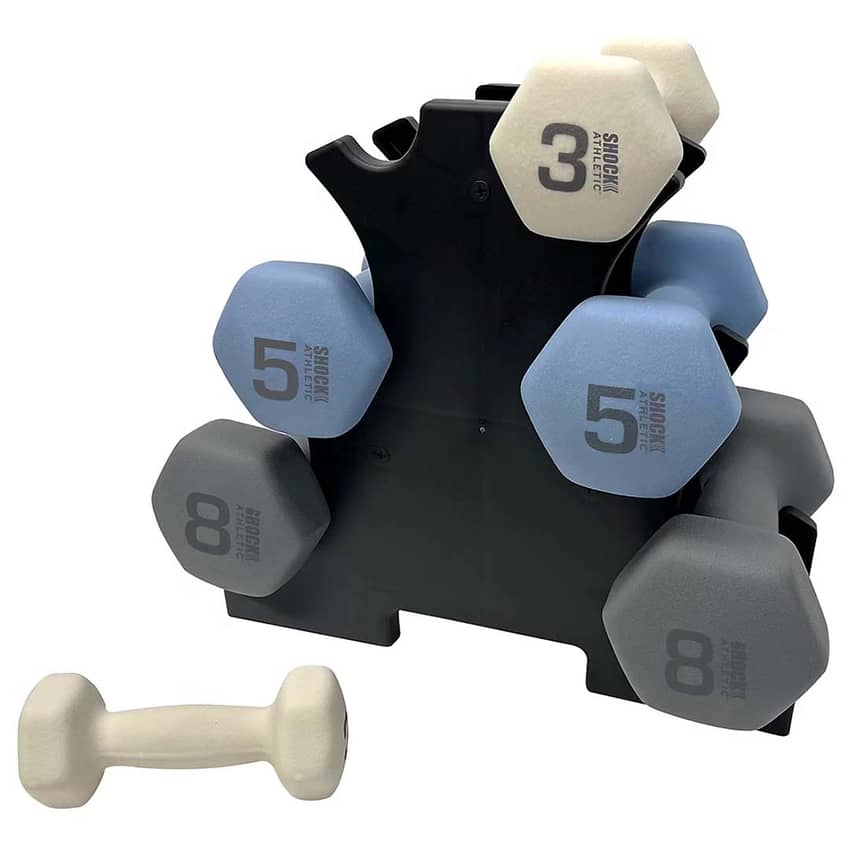 This 32-pound Shock Athletic Dumbbell Set with Storage Rack is the perfect partner for toning and sculpting your arms, shoulders, and back, offering an ideal solution for your workouts and effective strength training. The set features a beautiful and bright color-coded design with durable, high-quality neoprene coating. You'll appreciate the comfort and secure grip provided by the contoured handles, ensuring safe and easy use during your training sessions. The anti-rolling, hexagon-shaped dumbbell heads are thoughtfully designed for easy and stable storage on the included weight stand. This comprehensive set includes two 3-pound dumbbells, two 5-pound dumbbells, two 8-pound dumbbells, a convenient weight stand, and a helpful workout guide to kickstart your fitness journey.