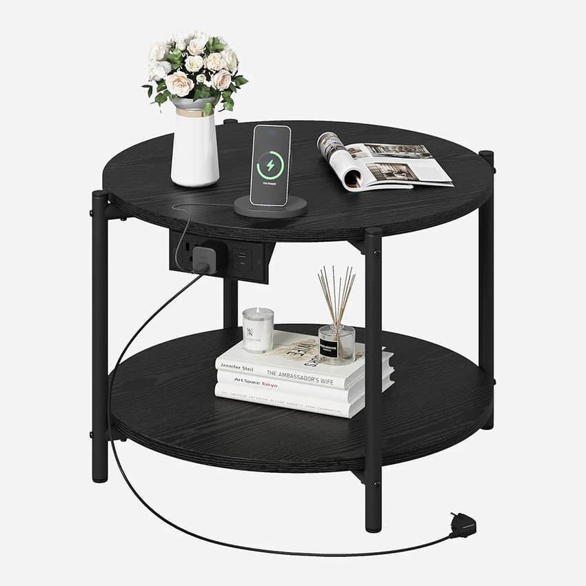 LIKIMIO 23.6" Double-Tiered Round End Tables with Charging Station, Black