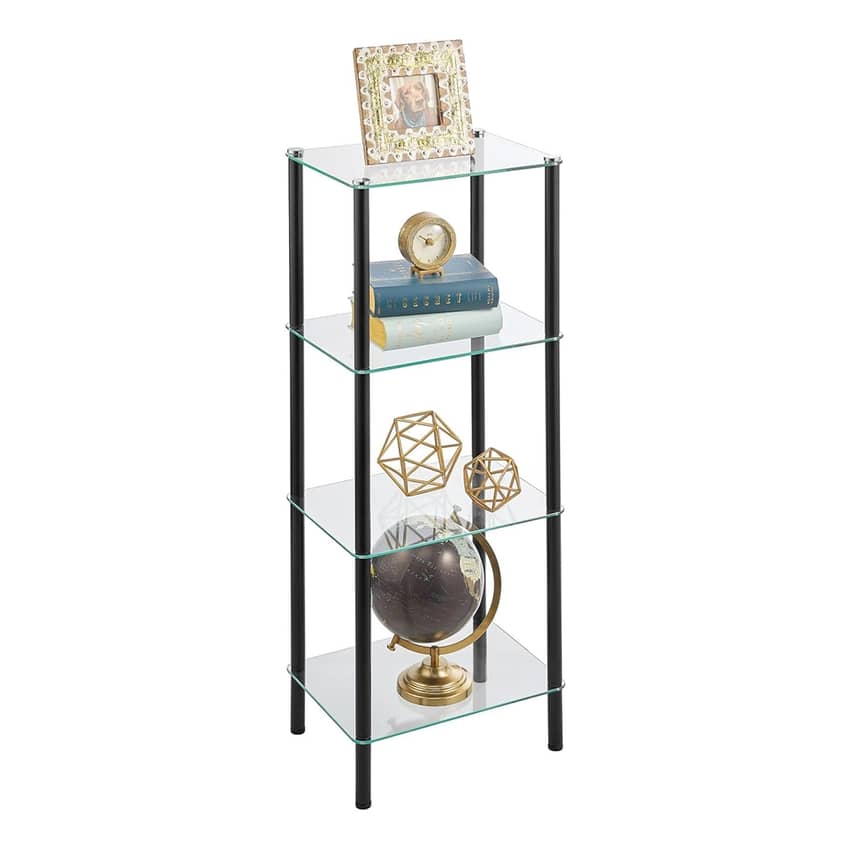 The mDesign 4-Tier Glass Shelf in black is the organizational solution designed to keep your home clutter-free. With four easy-reach, open-front glass shelves stacked in a compact vertical format, this durable organizer maximizes storage without sacrificing too much of that precious floor space. Its slim, modern design is great for small spaces like bathrooms or dorm rooms, but it is equally at home in a bedroom as a display for family photos, books, and collectibles. Combining a sleek black frame with transparent shelving, this unit offers a high-end look that brings style to any corner of your home. This shelf measures 15.75 inches long, 11.8 inches wide, and 40.5 inches high.