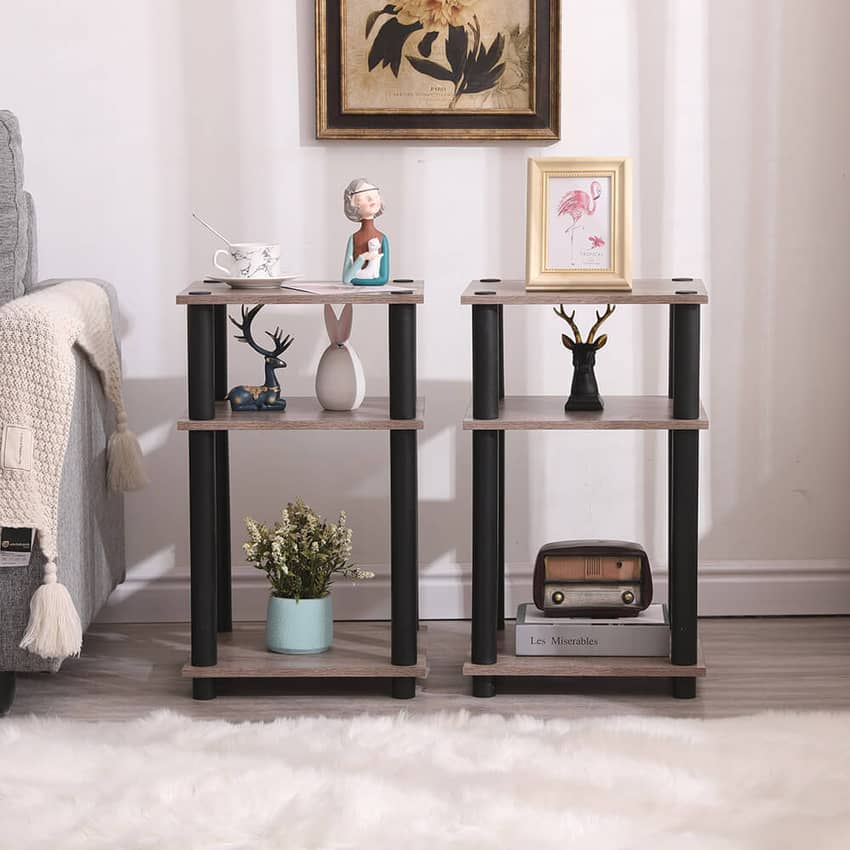 This set of two Turn-N-Tube end tables in oak gray and black are versatile and stylish end tables perfect for any room in your home. They're easy to assemble, space-saving, portable, and durable. Each end table is made with wood shelves and plastic poles. It has a sleek and modern design that will complement any decor. They're also very functional, with three tiers of storage space for books, magazines, remotes, and other items. Turn-N-Tube end tables are easy to assemble and disassemble with no tools required. The end tables are also lightweight and portable, so they can be easily moved around your home. The Turn-N-Tube end table is durable and sturdy. Each end table measures 13.4 inches long, 11.6 inches wide, and 2.8 inches high.