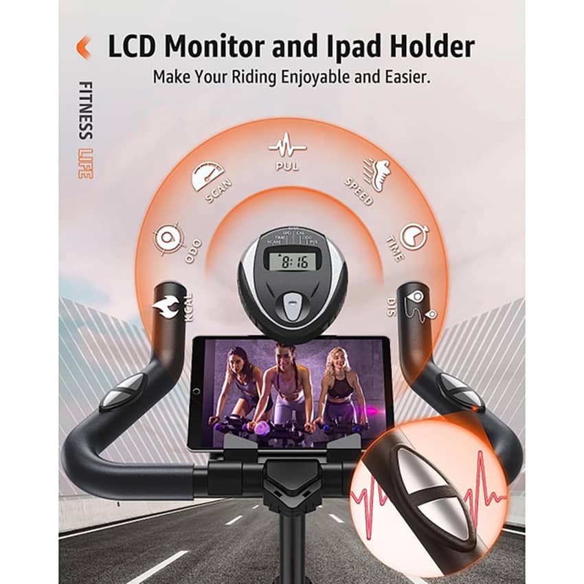 - LCD Monitor and Tablet Mount: The LCD monitor on the exercise bike tracks your pulse, time, speed, distance, calories burned, and odometer. The gift Tablet holder allows you to enjoy riding and music at the same time, making it easier to keep your workout