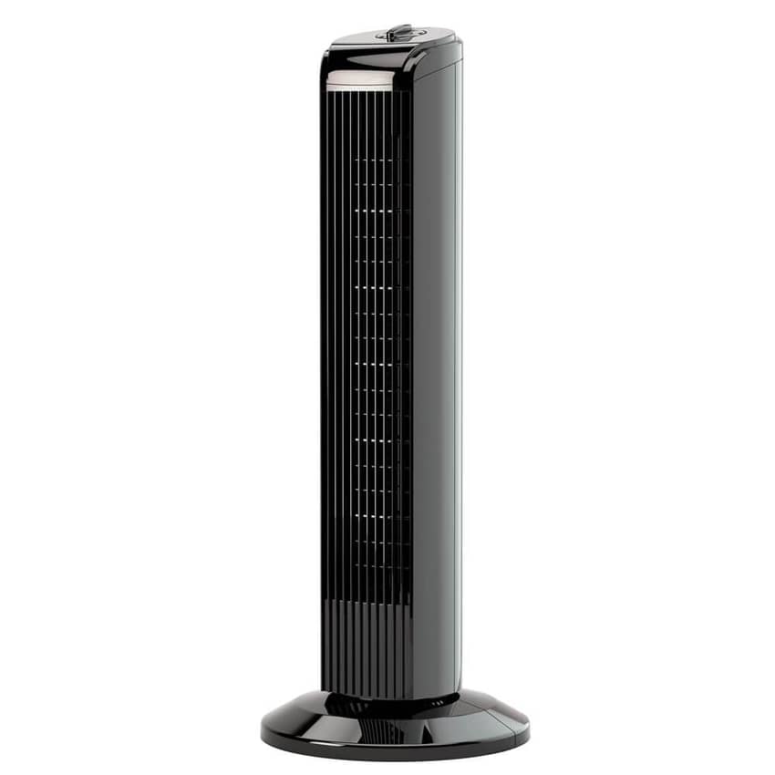Our private-label Penguin brand of fans is affordable and durable! Standing 28 inches high, this attractive tower fan has side-to-side motorized oscillation for maximum airflow, moving 1,800 cubic feet of air volume each minute. A three-speed rotary knob switch makes this fan easy to operate. The housing and base are lightweight plastic. A five-foot power cord gives you plenty of room to move this fan around your room.