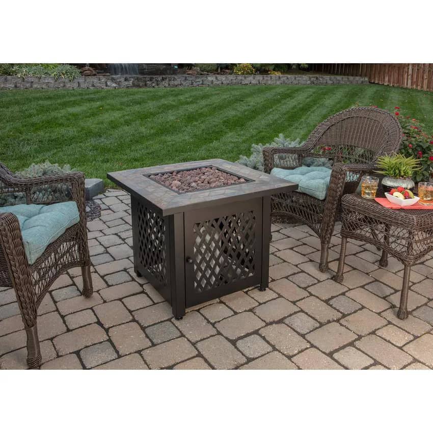 Elevate your outdoor living space with the Endless Summer 30-inch Steel Frame Slate Tile Mantel Gas Fire Pit, a captivating centerpiece boasting 30,000 BTUs of warmth. This handcrafted LP fire pit masterfully blends the classic elegance of high-end furniture with the robust durability of weather-resistant steel and a charming slate tile mantel. Its innovative design cleverly conceals a propane tank (not included) and control panel within its decorative base, maintaining a clean aesthetic. The unit comes complete with beautiful lava rock to enhance the dancing flames and a protective cover to ensure longevity, offering a sophisticated and inviting ambiance for all your outdoor gatherings. This fire pit weighs 73 pounds and measures 30 inches long, 30 inches wide, and 24 inches high.