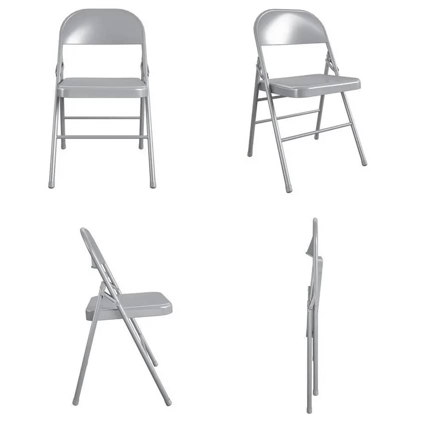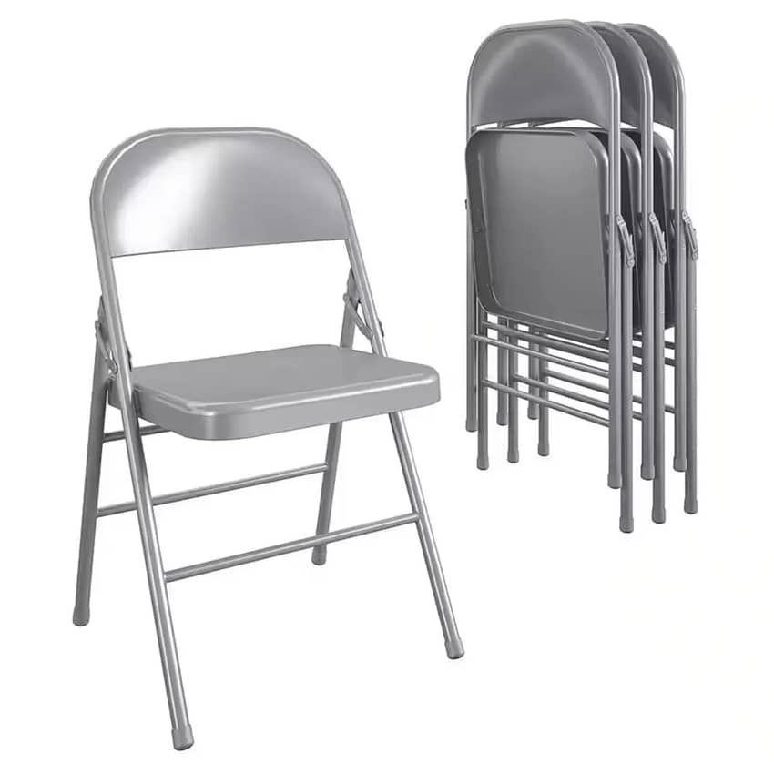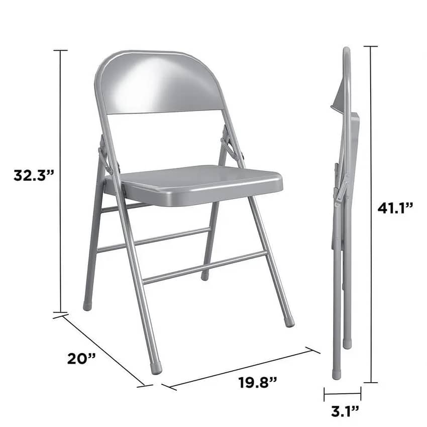 Secure, durable, and comfortable extra seating with the Cosco XL All-Steel Commercial Folding Chair, 4 Pack, in Gray. Manufactured using tough all-steel construction and finished with a neutral gray powder coating, these chairs are a viable solution for a multitude of seating needs, from birthday parties and get-togethers to extra dining room seating. Each chair is designed for maximum support with a contoured chair back and an extra-large seat pan, accommodating up to a 300 lb. weight capacity. Requiring no assembly, the chairs feature non-marring foot caps to protect your floor surfaces and fold compactly, making them easily portable and simple to store away when not needed. Each chair has a weight capacity of 300 pounds, weighs 12 pounds, and measures 19.8 inches long, 20 inches wide, and 32.3 inches high.