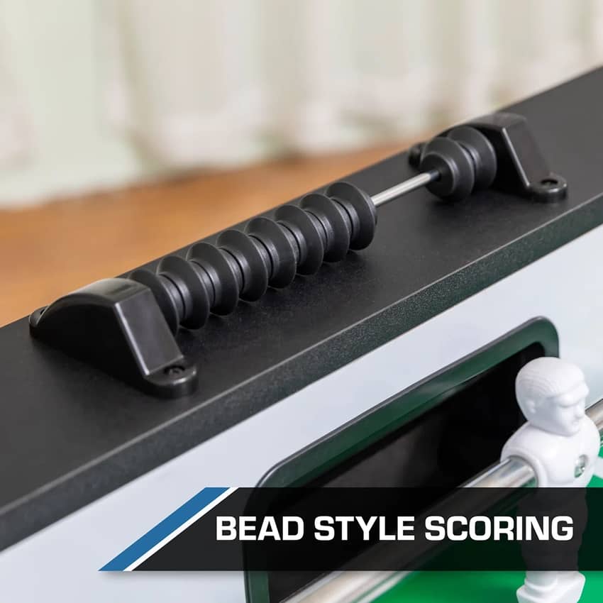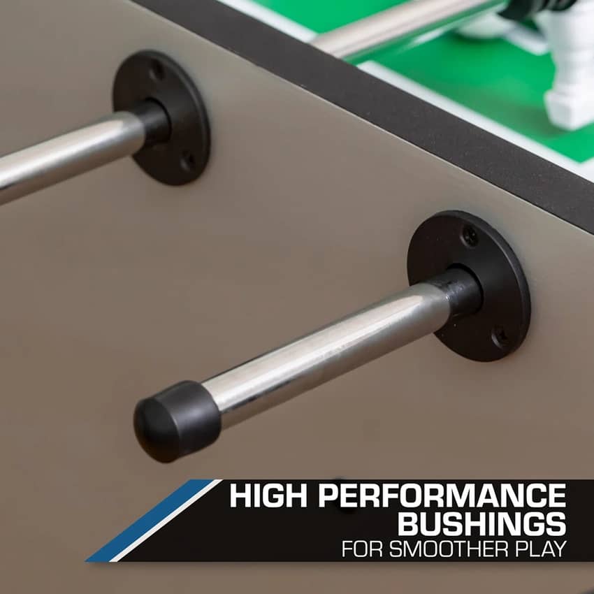 The EastPoint Sports Monaco Foosball Table is all you need for high-performance, fast-paced action, making it a premier addition to any game room or home bar. Pre-assembled player rods significantly reduce setup time so you can start the competition sooner. The solid steel rods feature weighted, balanced players for superior ball control, supported by high-performance bushings that allow the rods to spin and slide with ease. Get a fair match on any floor with the built-in leg levelers, which provide a stable, balanced playing surface, while the ergonomic comfort-grip handles and classic bead-style scoring keep you focused on the win. Optimized for rooms approximately 10 by 8 feet, this durable and stylish table delivers a professional-grade foosball experience for players of all skill levels. This foosball table measures 54.75 inches long, 29.5 inches wide, and 34.75 inches high.