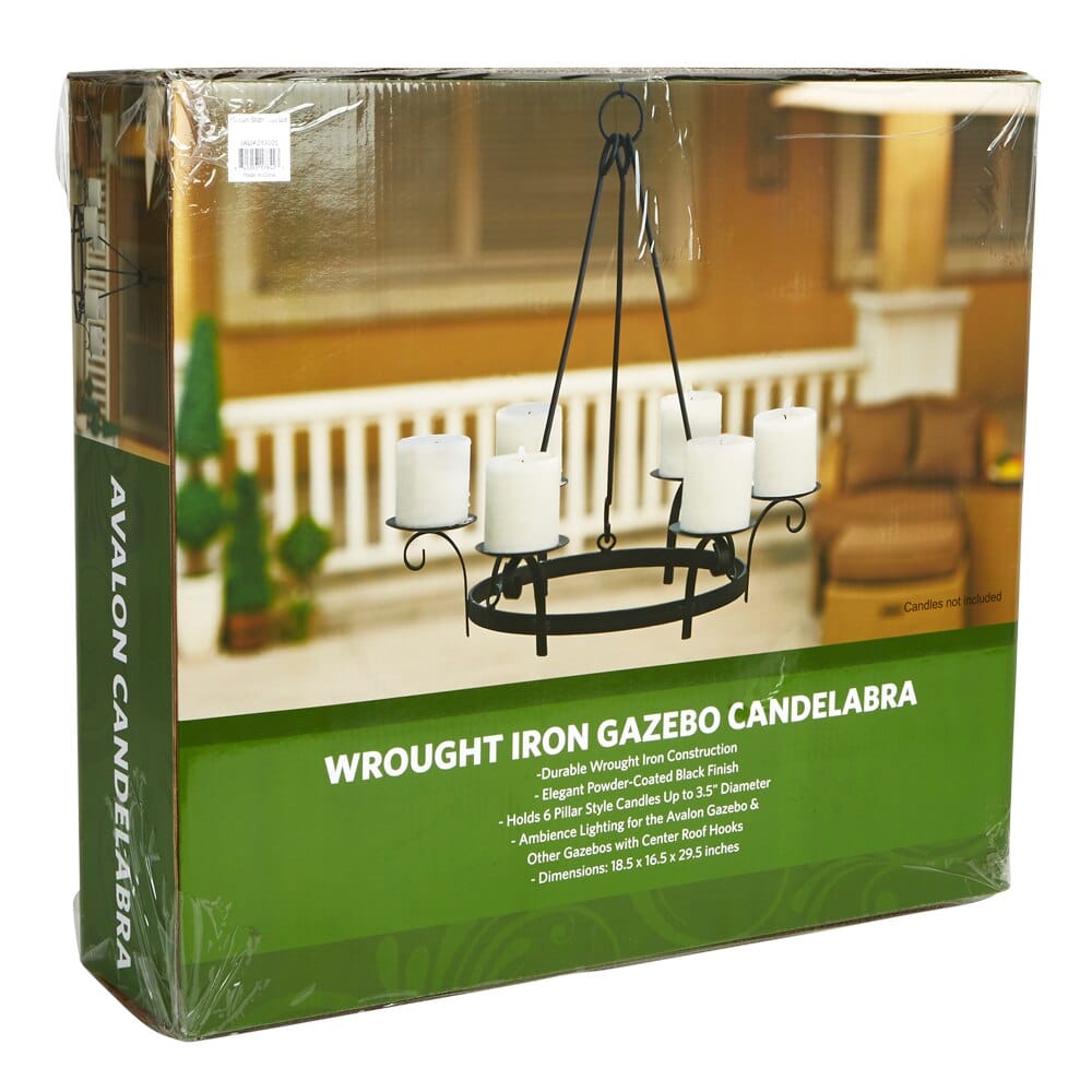 The Avalon wrought iron gazebo candelabra adds charm and sophistication to your outdoor area! Designed for use with gazebos with center ceiling hook, the durable black, powder-coated frame looks elegant and holds six pillar-style candles up to 3.5 inches in diameter. Candelabra base is 18.5 inches wide by 16.5 inches deep and is 29.5 inches high. Candles not included.