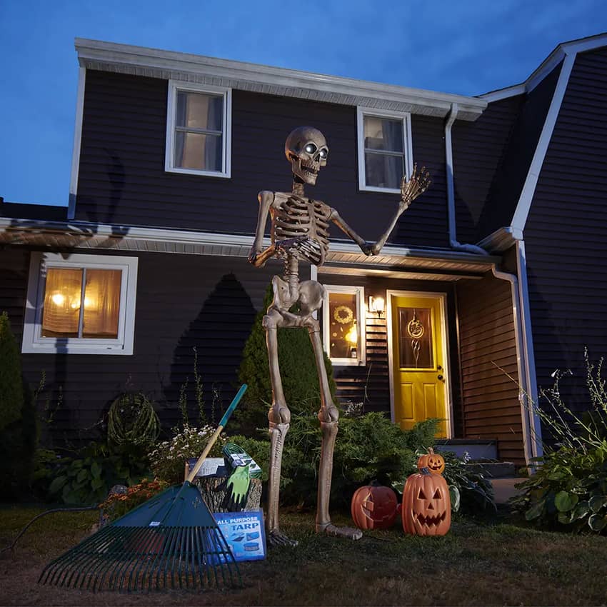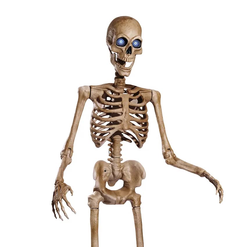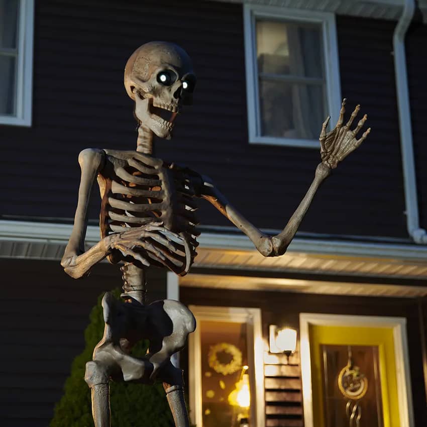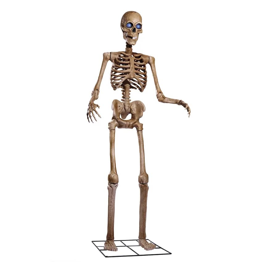 Meet Skully, the animatronic skeleton that's guaranteed to be the centerpiece of your Halloween festivities. Skully comes to life with seven funny phrases, and his mouth moves in sync as he speaks. His chilling blue animated projection eyes add an extra layer of fun and spookiness, and he's motion-activated to surprise unsuspecting guests. With repositionable arms and adjustable volume, you can customize his look and sound for the perfect fright. Built for both indoor and outdoor use, Skully is ready to haunt your home or yard all season long. Skully measures 37 inches long, 39 inches wide, and 96 inches high.