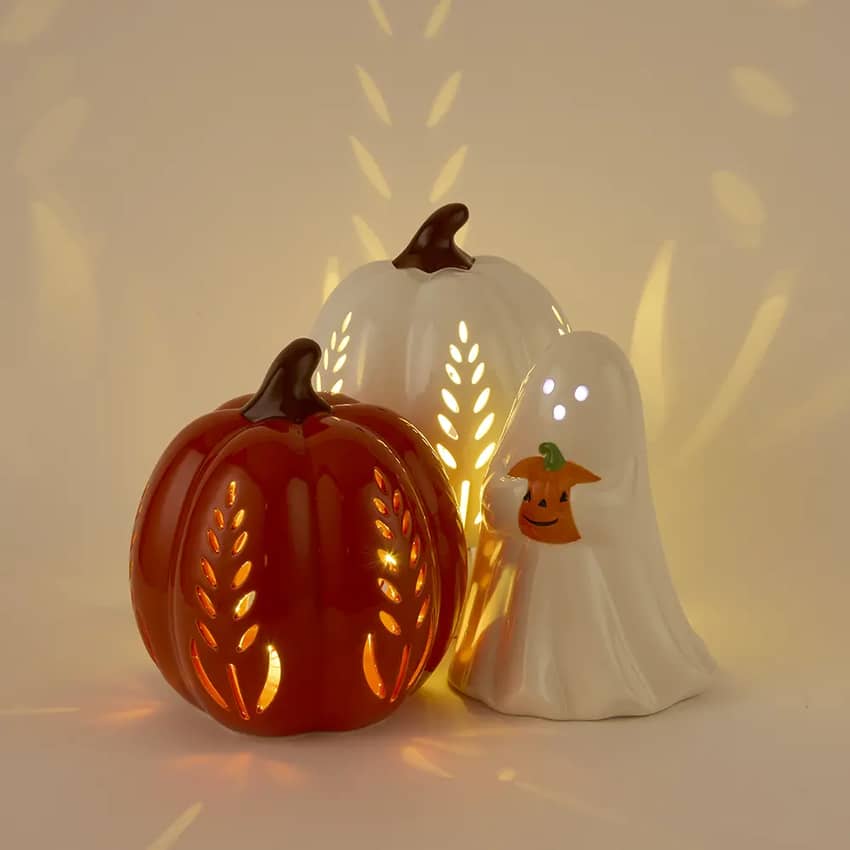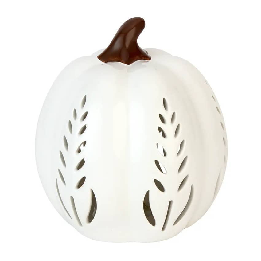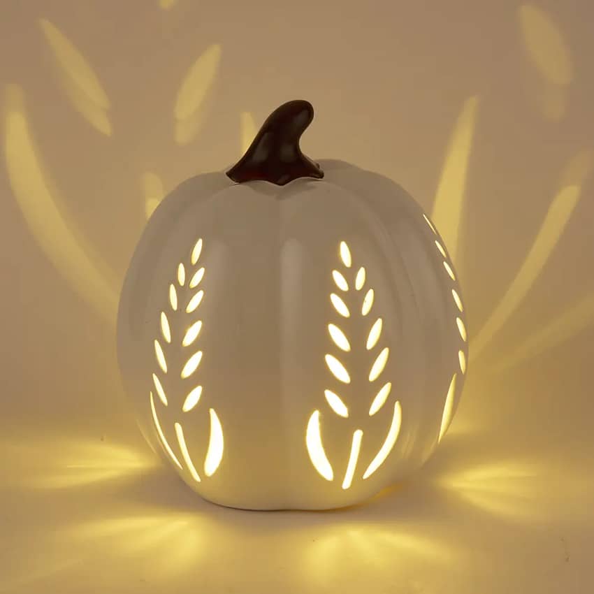 - A sophisticated white ceramic pumpkin with decorative cutouts that create a beautiful light pattern.