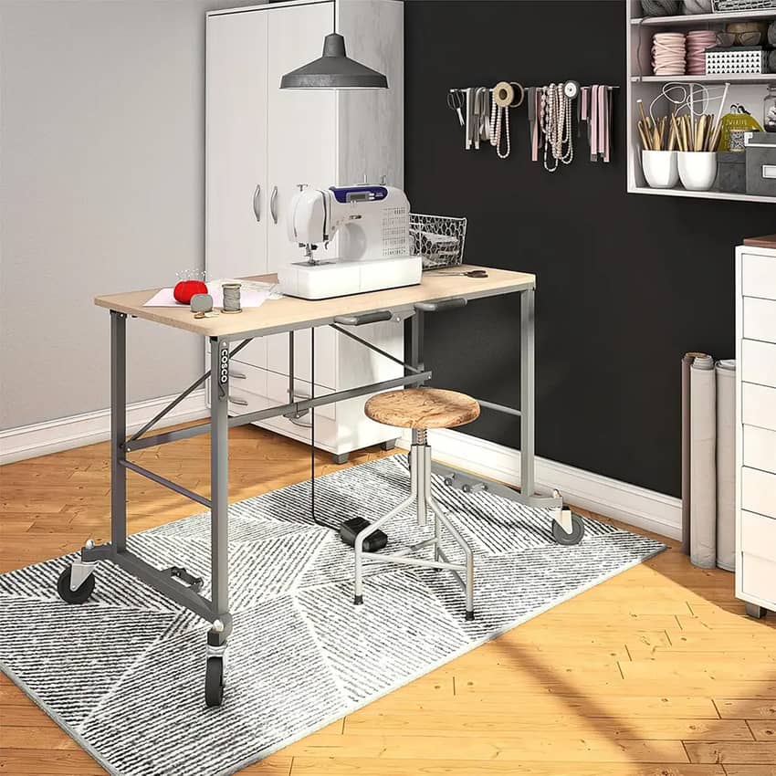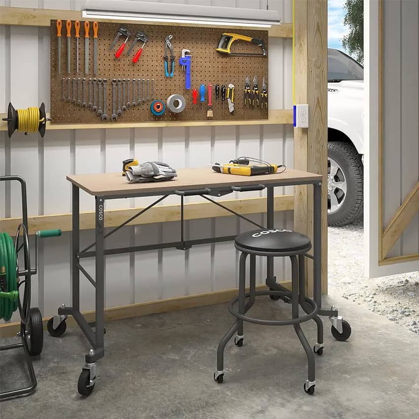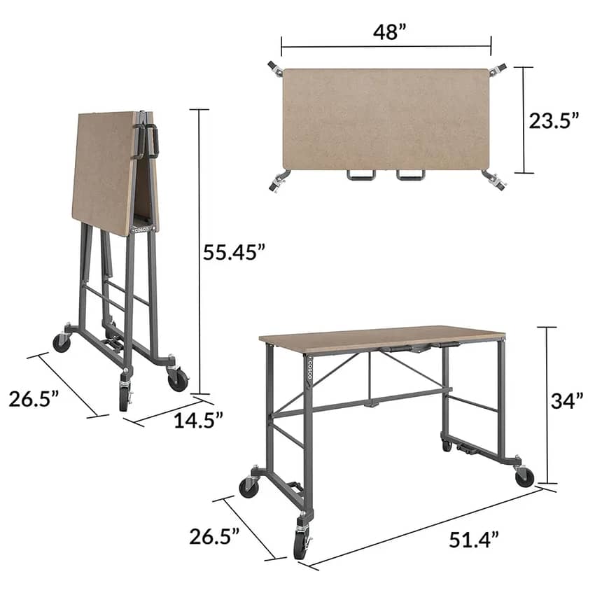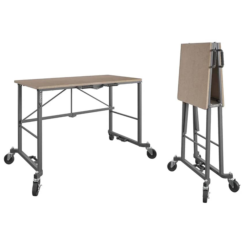 Designed for ultimate convenience and portability, the Cosco Smartfold Portable Folding Work Desk is the perfect solution for anyone needing a versatile workspace on the go. This workbench is made with durable steel and features a sturdy MDF top with a substantial weight capacity of 350 pounds, providing ample working space for a wide range of projects. When your work is done, the desk folds down in seconds for compact storage and easy transportation. Equipped with two locking casters, you can effortlessly move the desk to your desired location and securely lock it in place while you work. Whether for crafting, home repairs, or professional tasks, this portable desk offers the strength and flexibility you need. This portable desk measures 51.4 inches long, 26.5 inches wide, and 34 inches high.