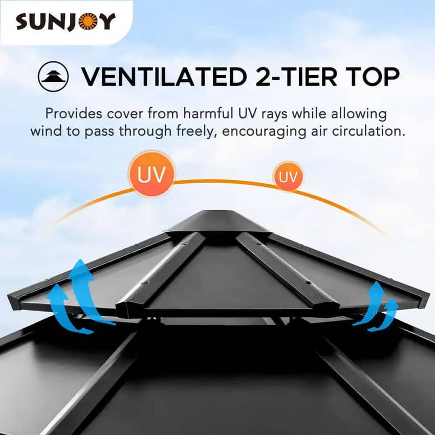 - Ventilated 2-Tier Top: The ventilated 2-tier steel top provides protection from harmful UV rays while allowing wind to pass through freely encouraging air circulation and creating a comfortable and open outdoor space for your enjoyment