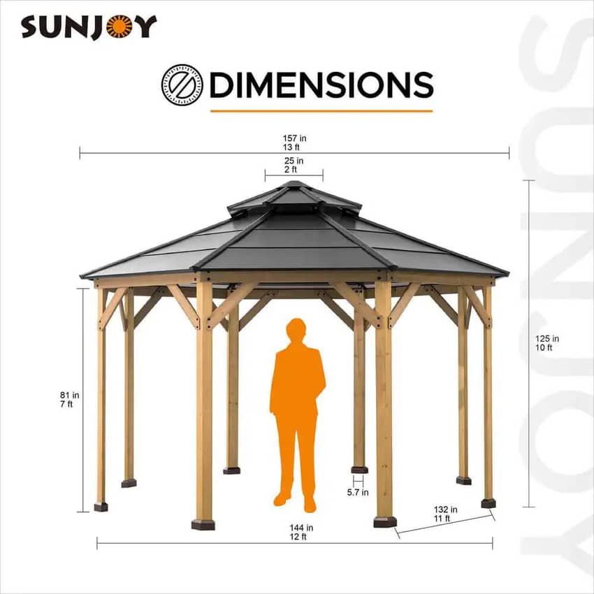 Create an inviting outdoor space with the Lancaster Octagon Hardtop Cedar Gazebo. The ventilated two-tier steel top not only protects from harmful UV rays but also encourages air circulation, making it a comfortable and open area to enjoy. Hang your favorite chandelier from the built-in ceiling hook to encourage guests to linger a little longer, or hang your favorite potted plant to give it a personal touch. The premium cedar wood frame construction comes pre-cut and pre-drilled, and the metal frame has a built-in dual rail system for hanging mesh netting or privacy curtains (not included). Powder-coated steel anchoring plates make it easy to mount and fix to your outdoor patio. The durable black steel roof can withstand snow loads of 22.5 pounds per square foot and steady winds of 31.1 miles per hour. This gorgeous gazebo can be secured to your lawn (including accessories), a wooden deck or patio (without accessories), or a concrete pad (without accessories). Assembly is made easy with the included illustrative instructions, and the gazebo comes in two boxes. Once assembled, this gazebo weighs 411.16 pounds and measures 13 feet long, 13 feet wide, and 10.4 feet high (from the ground to the outside of the vented top).