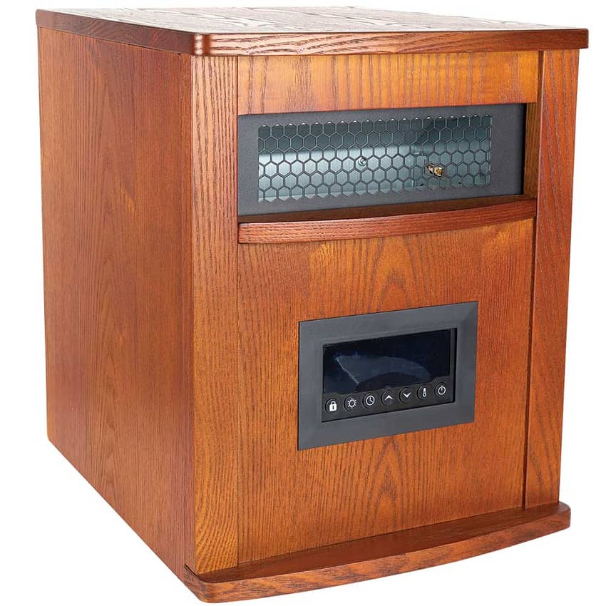 Cozy up to this Lifesmart six-element infrared space heater and stay warm all season long! This discreet heater comes in a brown burnished oak finish and boasts four infrared quartz heating elements plus two mica heating elements for faster heat up. Easy glide casters let you move the unit wherever you need heat. Key features include three heat settings, a 12-hour programmable timer, and a lifetime washable filter. Safety features include a cool-touch exterior, child safety lock, tip-over safety switch, and overheat safety switch. Comes with remote control with an LED indicator (2 AAA batteries not included).