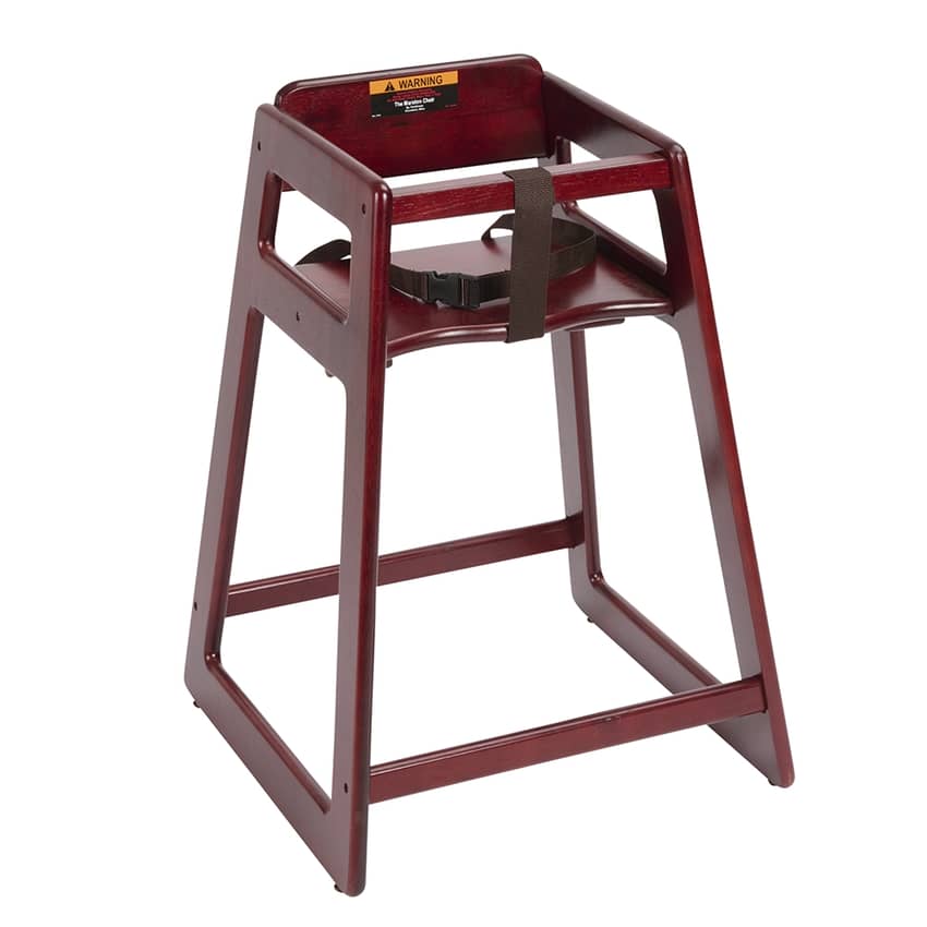 Ensure your youngest patrons are both safe and stylish with the Tomlinson Industries Stacking Restaurant Wood High Chair in a deep Cherry finish. Designed with a wide A-frame base, this chair provides exceptionally sturdy support so smaller guests can enjoy their meals securely. Assembled for immediate use, this high chair is also conveniently stackable, making it an essential and space-saving piece of furniture for any bustling restaurant or commercial dining setting. Each high chair weighs 18 pounds and measures 12.5 inches long, 13 inches wide, and 27 inches high.