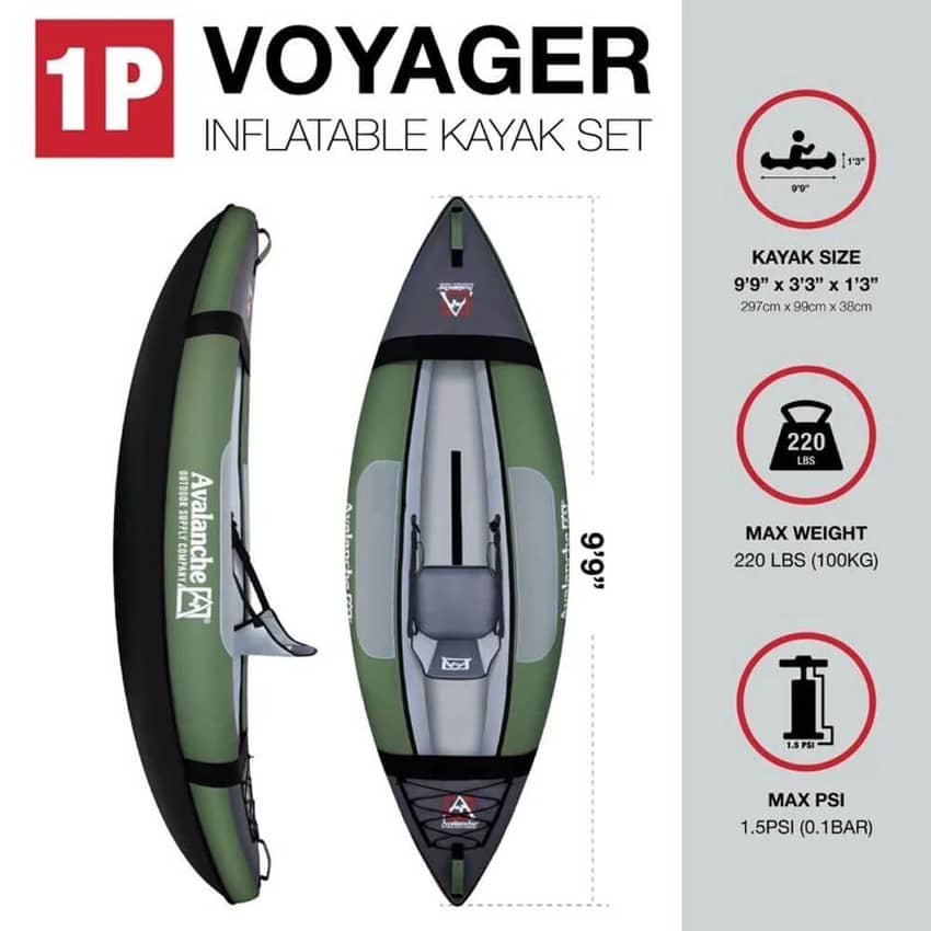 - Avalanche Inflatable 1-Person Voyager Kayak: An inflatable 1-person Kayak