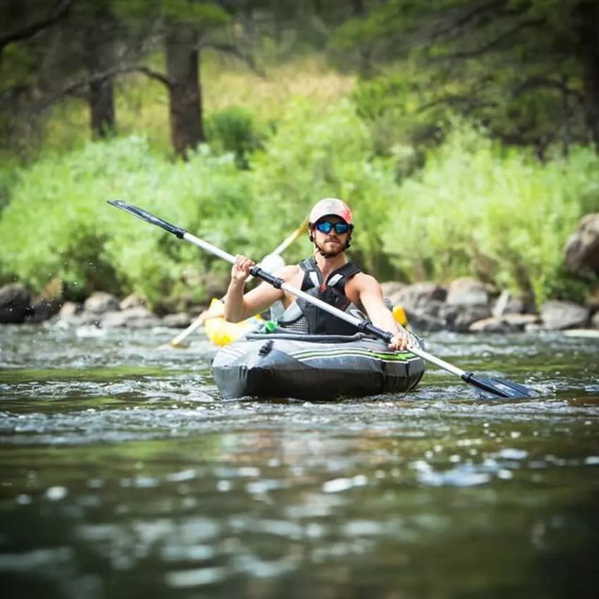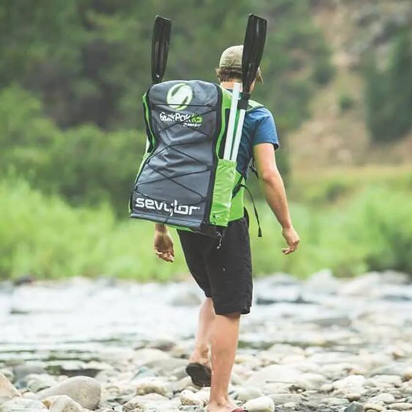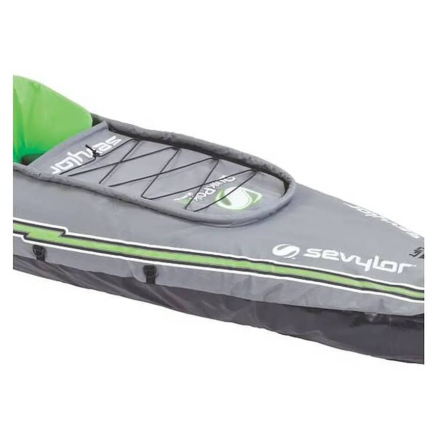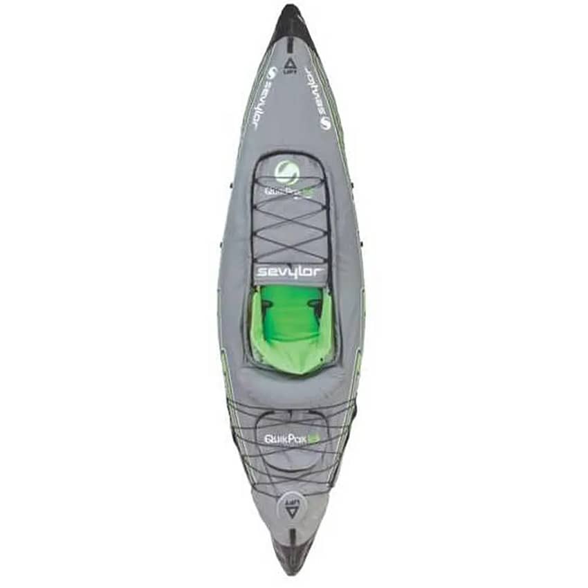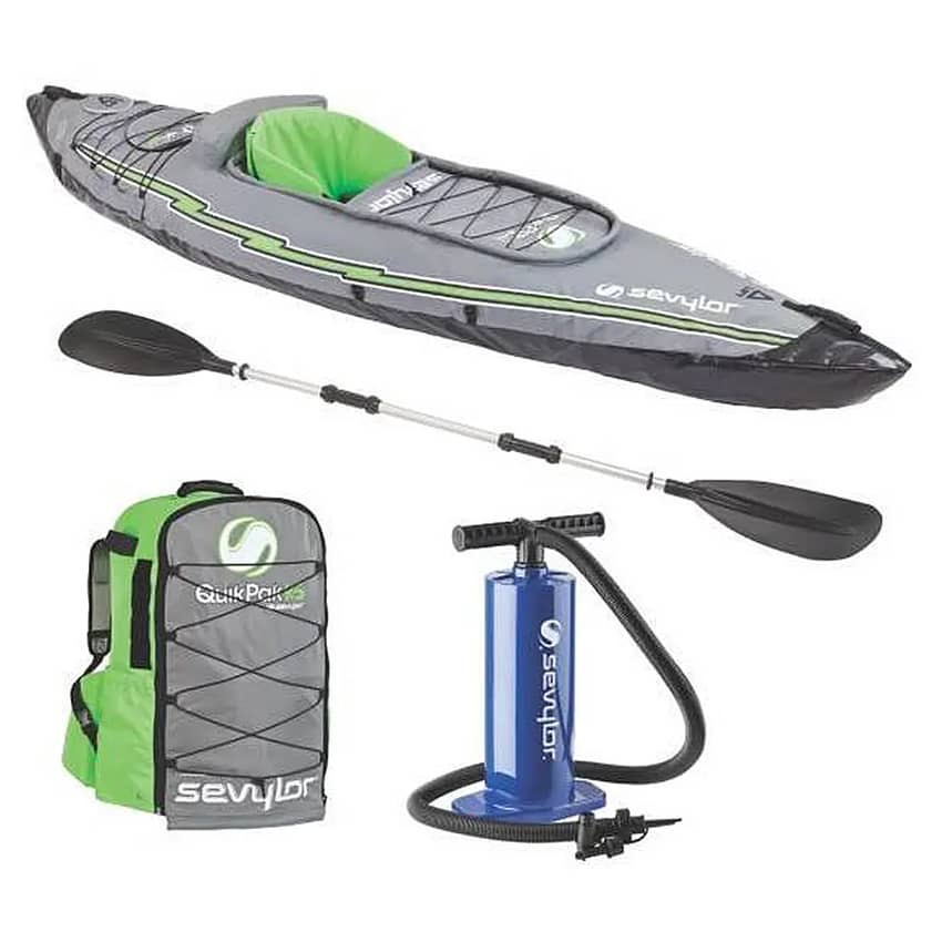 Experience unparalleled convenience and adventure on the water with the Sevylor Quickpak K5 1-Person Inflatable Kayak in gray and green. Designed for quick setup, this kayak features an innovative backpack system that ingeniously transforms into your seat, getting you onto the water faster. A tarpaulin bottom and polyester cover provide exceptional durability and puncture protection, while the Airtight® System prevents any leaks. Inflation and deflation are no problem thanks to Double Lock™ valves with two locking points, and D-rings offer easy attachment for extra gear. With secure bungee storage areas for your essentials and convenient carry handles for effortless transport, this 10-foot kayak, capable of supporting up to 250 pounds, is your ideal companion for solo aquatic escapades. This inflatable kayak measures 120 inches long, 34.8 inches wide, and 18 inches high.