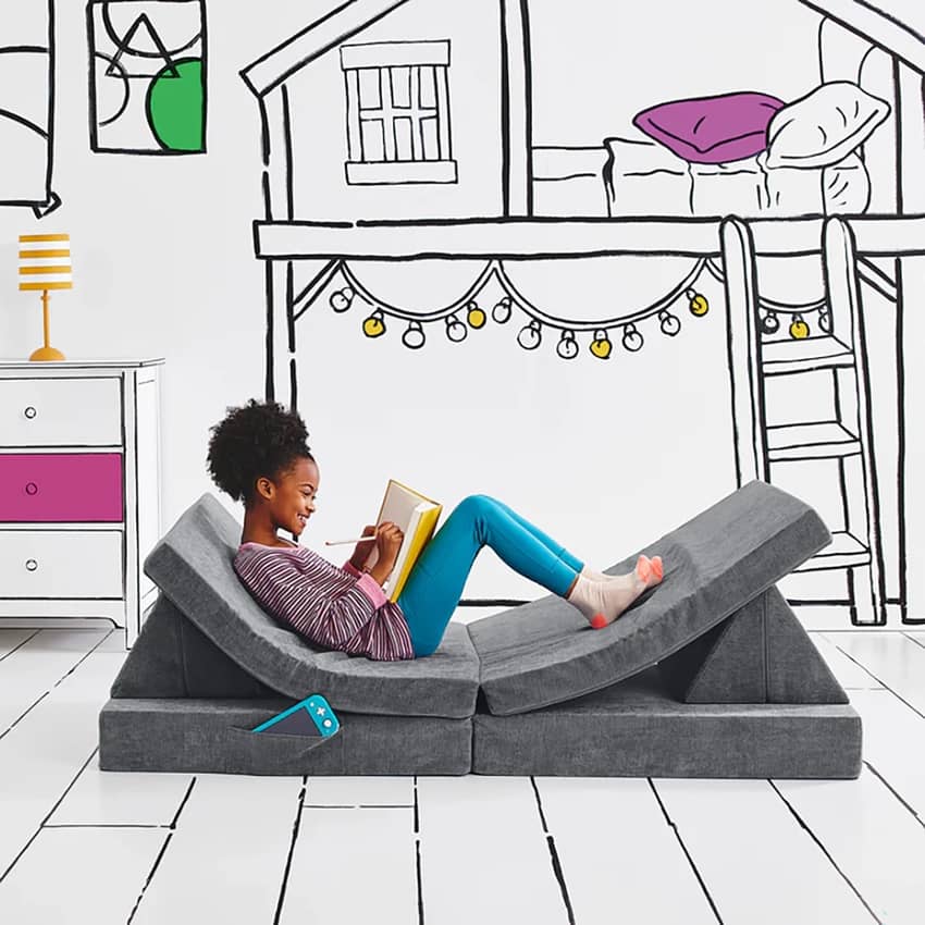 The Yourigami Folding Convertible Play Couch in Fossil Gray offers a sophisticated, neutral aesthetic that blends seamlessly into any modern home while providing endless creative possibilities for children over three. This modular four-piece set is crafted from CertiPUR-US certified eco-friendly foam, ensuring a durable, environmentally conscious foundation that can be rearranged into countless configurations, from a cozy reading nook to a fun fort. Your imagination is the limit! The soft, landscape-inspired fabric covers are as practical as they are stylish, featuring zippered, machine-washable covers for stress-free cleanup, small pockets to store books and toys, and handles for effortless portability. This play couch is designed for convenience, tucking neatly under a bed or in a closet when playtime ends. Adult supervision is required during use.