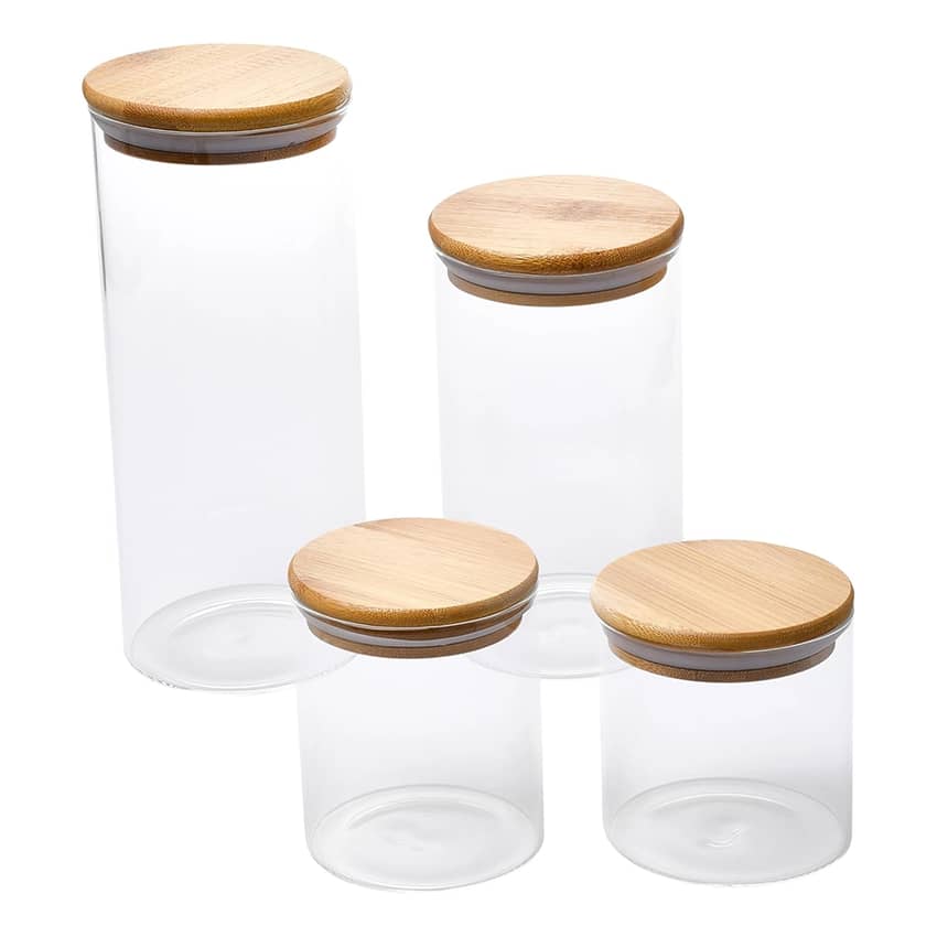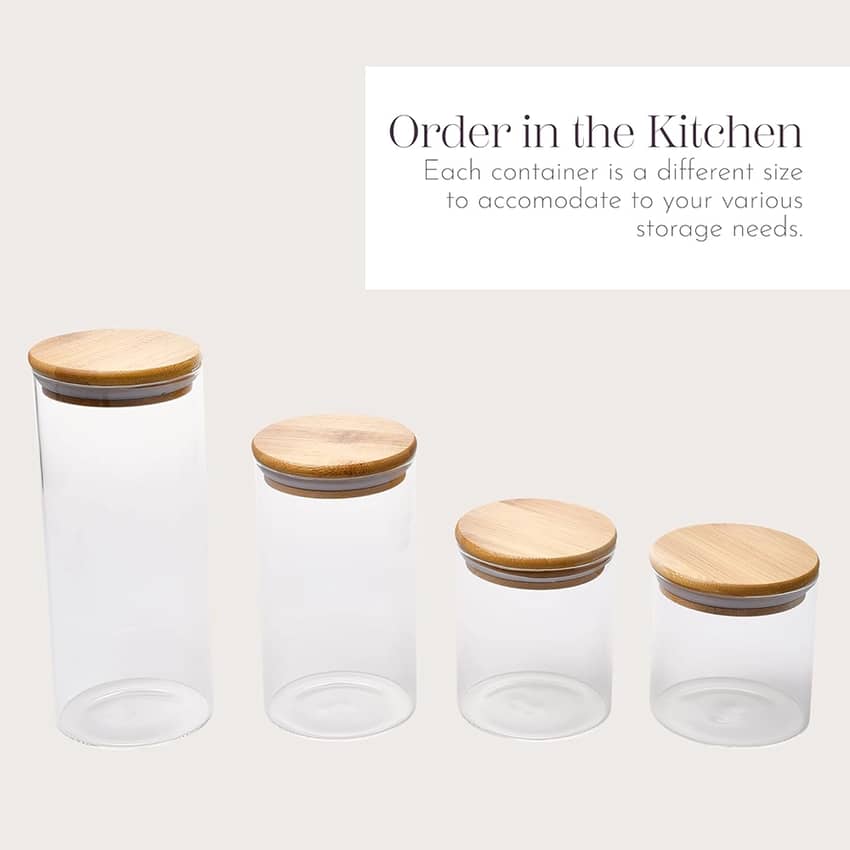 - These storage jars are not only practical but also stylish. The glass containers with bamboo lids add a touch of elegance to your kitchen. These kitchen canisters are perfect for storing a variety of items, from flour sugar storage containers to pasta and cereal