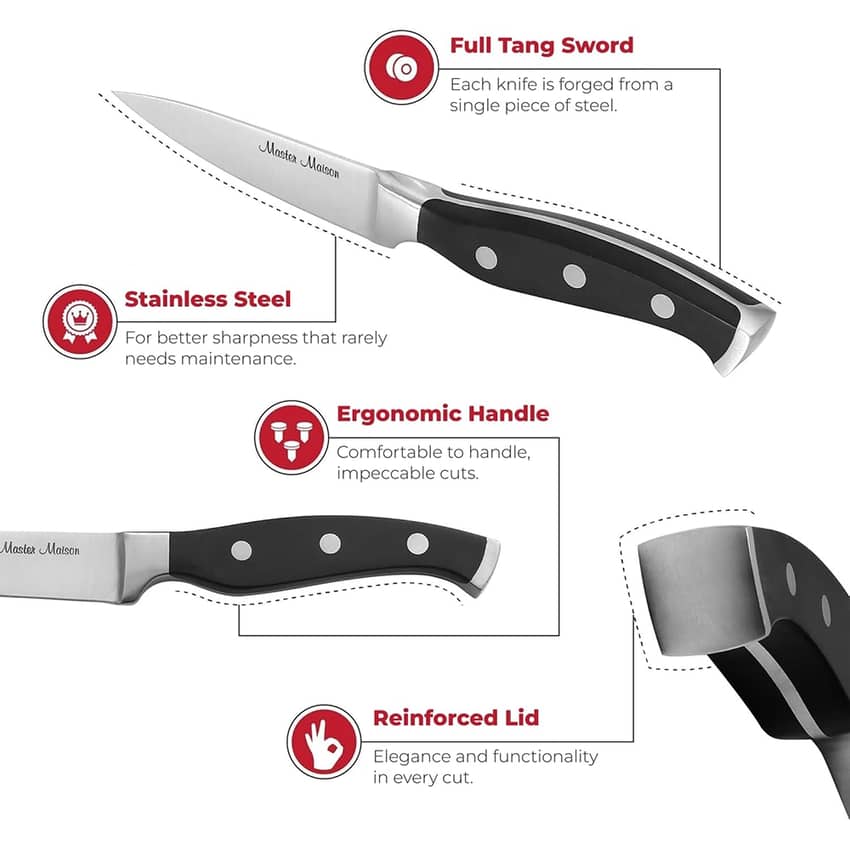 Founded by lifelong cooks, the Master Maison Stainless Steel Paring Knife brings professional-quality precision to your everyday kitchen tasks. This essential knife is meticulously forged from a single piece of high-carbon, German stainless steel, resulting in a razor-sharp blade perfect for intricate work like peeling fruits and vegetables, deveining shrimp, or creating delicate garnishes. The innovative design ensures a balanced weight that maximizes cutting precision while minimizing hand fatigue. With its sleek, modern aesthetic, this durable paring knife offers premium performance at an approachable price. This knife blade measures 3.5 inches long.