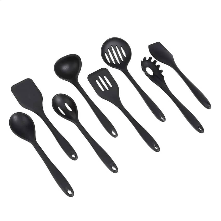 This eight-piece nonstick heat-resistant silicone cooking utensil set is built to last! These essential tools boast superior durability, combining food-grade, nonstick silicone for flexibility with a sturdy iron core for added strength. Say goodbye to scratched pans and wobbly handles! The soft silicone coating ensures a secure, comfortable grip, while remaining gentle on your precious nonstick cookware. Heat up your culinary creations without fear, as these utensils are heat-resistant up to 428-degrees Fahrenheit. Whether you're flipping delicate pancakes or searing succulent steaks, these versatile tools can handle it all. The set includes everything you need for everyday cooking: a turner, slotted turner, slotted spoon, basting spoon, soup spoon, skimmer, spaghetti spoon, and spatula. Cleaning up after culinary adventures is a breeze! Simply toss them in the dishwasher for effortless post-meal cleanup. With its sleek black design and unmatched functionality, this eight-piece set is a must-have for any kitchen looking for style and performance.