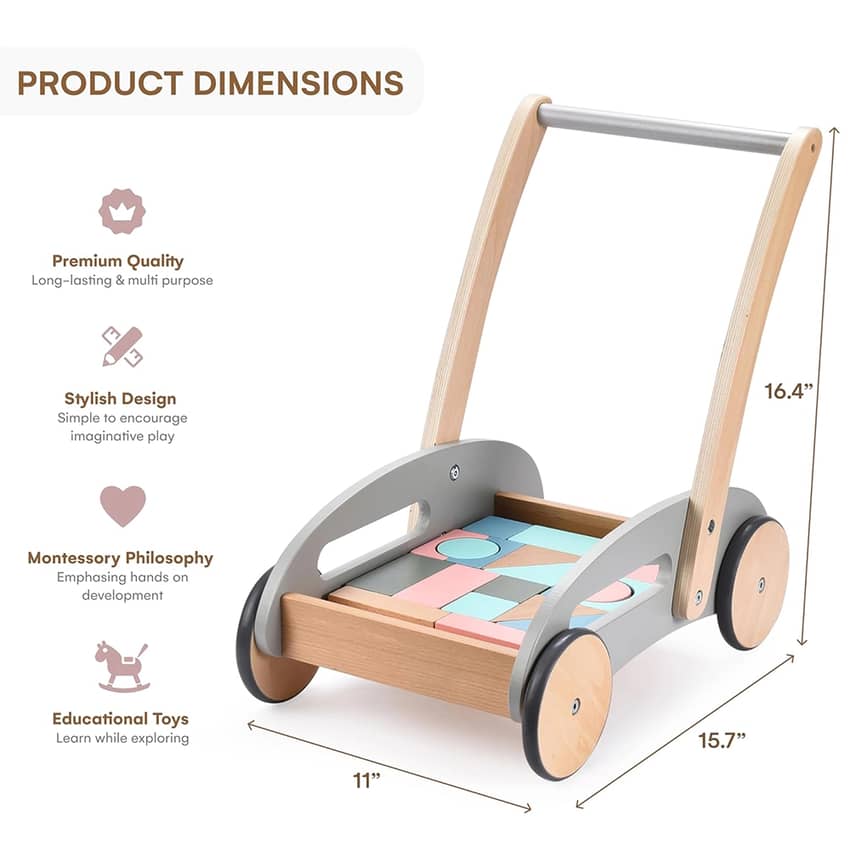 Help your little one confidently take their first steps with the Childlike Behavior Wooden Baby Push Walker with Wheels in Gray with multi-colored building blocks. This multi-purpose walker isn't just for walking; it's a fantastic tool for developmental play, with a sturdy design that provides stability as your baby learns to walk. It also comes with colorful building blocks that encourage creative play, engaging your baby's imagination and cognitive skills as they explore and build. Designed with safety as a top priority, this push toy has smooth edges and is made with non-toxic materials, giving parents and their babies a worry-free play experience. This walker is an excellent addition for indoor adventures, fostering your child's motor skills, balance, and coordination through interactive play, making it a valuable tool for early learning. This baby push walker measures 11 inches long, 15.7 inches wide, and 16.4 inches high.