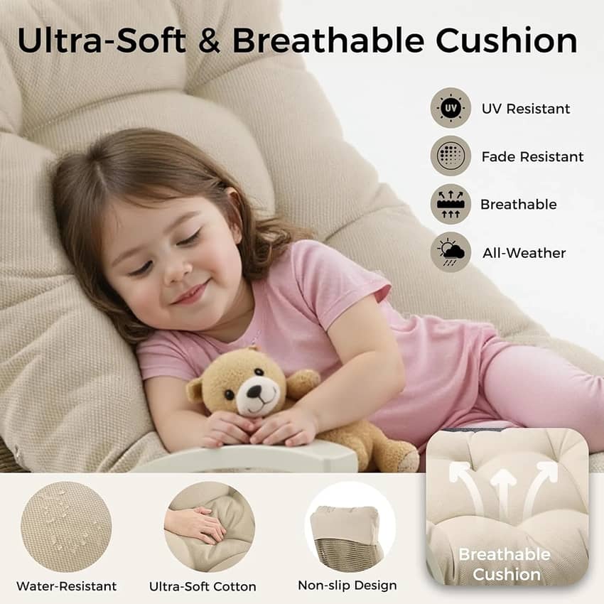 The IRONCK Patio Rocking Chair in beige is a masterclass in comfort, blending premium twisted rattan with a high-performance alloy frame for a sturdy, comfortable seat. Engineered with automated welding technology and an ergonomic bowl shape, with curved armrests and a silent rocking motion, dampened by specialized rubber pads, keeps your relaxation silent. The experience is completed by plush, high-resilience foam cushions wrapped in waterproof Olefin fabric, offering a cloud-like feel that retains its shape against the elements. This chair measures 25 inches long, 46 inches wide, and 31 inches high.