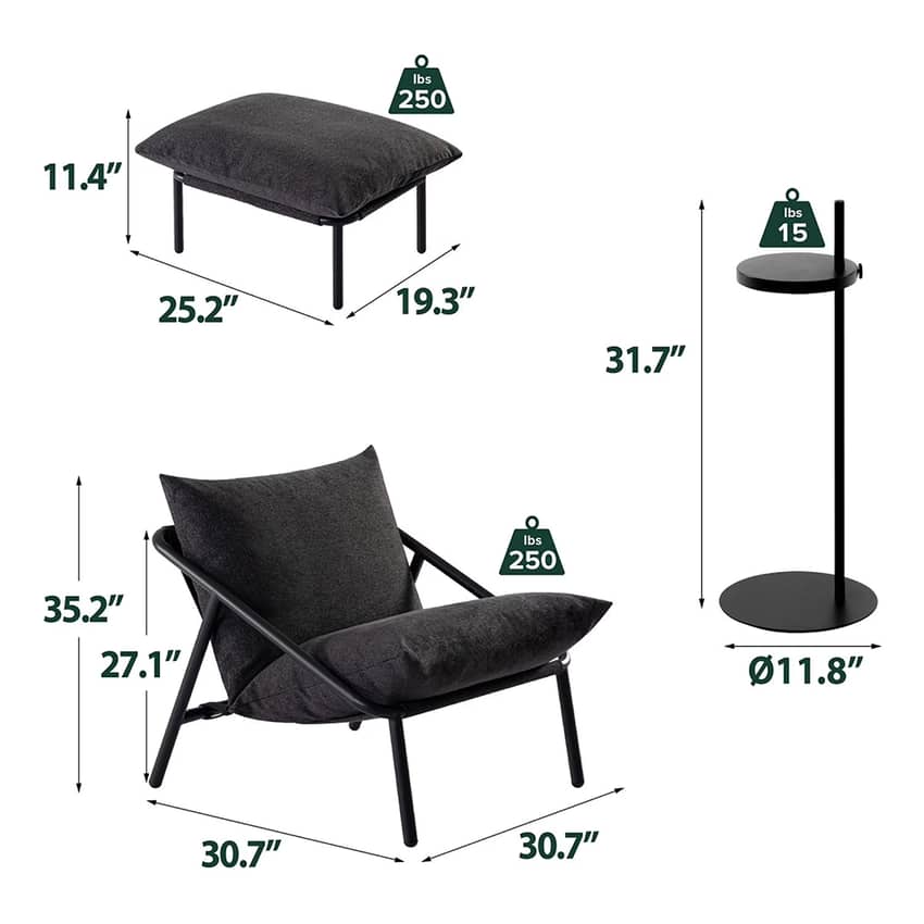 Transform your space into the ultimate relaxation station with the sleek and modern Zinus Callie Sling Accent Chair, complete with a matching ottoman and drink table. Featuring a dark gray sling seat and minimalist lines, the chair seamlessly fits into any decor, from your living room to your home office. Experience next-level comfort with soft, shredded foam cushions that cradle your body, offering a comfortable, sink-in feeling across the extra-wide seat and backrest, ensuring hours of customized support. Crafted with a sturdy steel frame that supports up to 250 pounds, this durable construction is built to last, while the high-quality, textured fabric ensures both a luxurious touch and easy maintenance. Unwind in style as you kick back, put your feet up, and keep your favorite beverage within arm's reach. Best of all, setting up this complete ensemble is simple and stress-free. All parts and tools arrive in one convenient box, allowing you to assemble the chair, ottoman, and drink stand in less than 30 minutes.