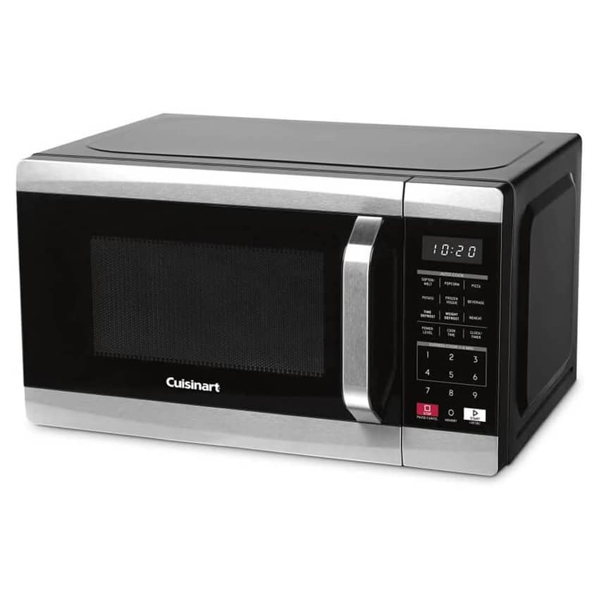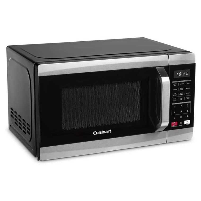 Update your kitchen with the Cuisinart stainless steel compact microwave oven! This sleek and stylish factory-refurbished 0.7-cubic-foot powerhouse packs all the functionality you need into a package that won't crowd your counters. Its brushed stainless steel finish complements any kitchen decor, while 700 watts of power and 11 adjustable settings unleash endless culinary possibilities. Go from reheating leftovers to whipping up popcorn with user-friendly preprogrammed touchpad functions. Whether you're craving pizza, defrosting frozen veggies, or heating a comforting beverage, this microwave does it all with effortless ease. Need to thaw? Choose defrosting by weight or time for perfectly thawed results every time. Plus, save your favorite settings with the handy memory function for ultimate convenience. Two-stage cooking lets you tackle more complex dishes, giving you total control over your culinary creations. And the best part? This factory-refurbished wonder comes with a 90-day warranty and genuine parts, ensuring quality and performance that won't disappoint. Upgrade your kitchen with this versatile Cuisinart microwave oven. It's the perfect combination of style, versatility, and user-friendly technology, ready to become your new kitchen sidekick! This microwave weighs 25.4 pounds and measures 17 inches wide, 11.5 inches deep, and 10 inches high.
