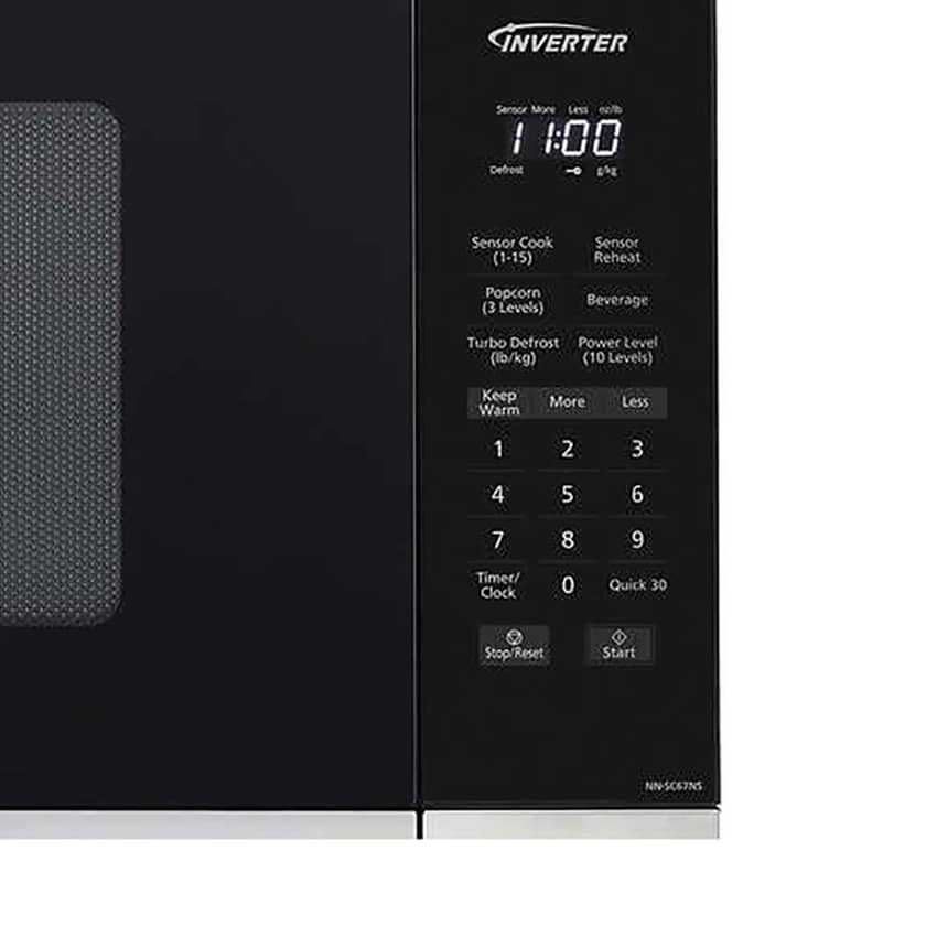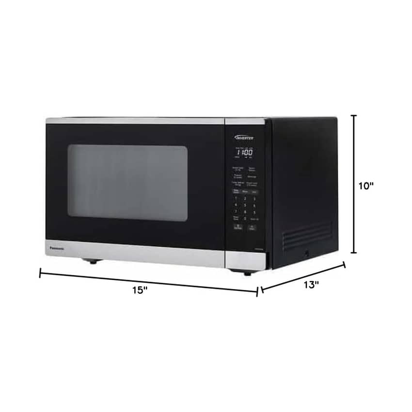 Bring efficient and stylish cooking to your countertop with the factory-refurbished Panasonic 1.3 cubic foot Microwave Oven. Boasting a generous capacity, this appliance comfortably accommodates a variety of dishes, making it ideal for everyday meals or larger gatherings. Its sleek black and silver design adds to any kitchen decor. Experience powerful and even cooking thanks to advanced technology, while the user-friendly controls and preset options simplify meal preparation. Sensor cooking takes the guesswork out by automatically adjusting time and power based on food moisture, and the innovative inverter technology ensures consistent power delivery for delicate tasks like melting and defrosting. Despite its powerful performance, the compact countertop design makes it a perfect fit for kitchens where space is essential. This microwave oven weighs 30.5 pounds, has a capacity of 1.3 cubic feet, and measures 15 inches long, 13 inches wide, and 10 inches high.