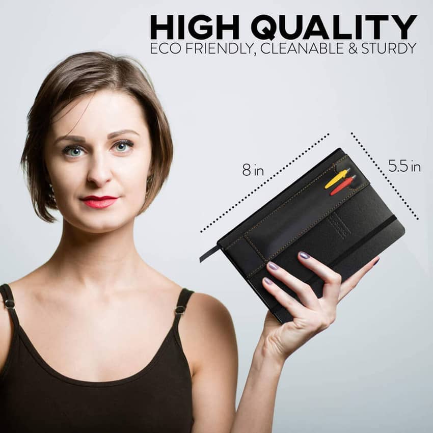- Premium PU Leather: Our textured journal feels smooth and soft in your hands, and the faux leather gives it a clean, polished look that is timeless and versatile. The spine is sturdy to ensure that you can use it for a long time. It comes with a removable pen loop to carry pens and a strong, expandable pocket inside